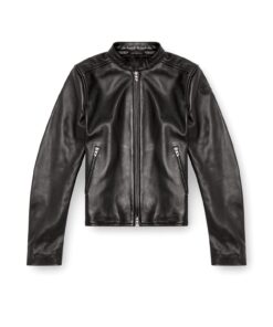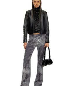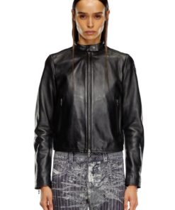 ג׳קט עור שחור בגזרת בייקר עם כיסים, סגירת רוכסן ולוגו D מוטבע על הכתף
