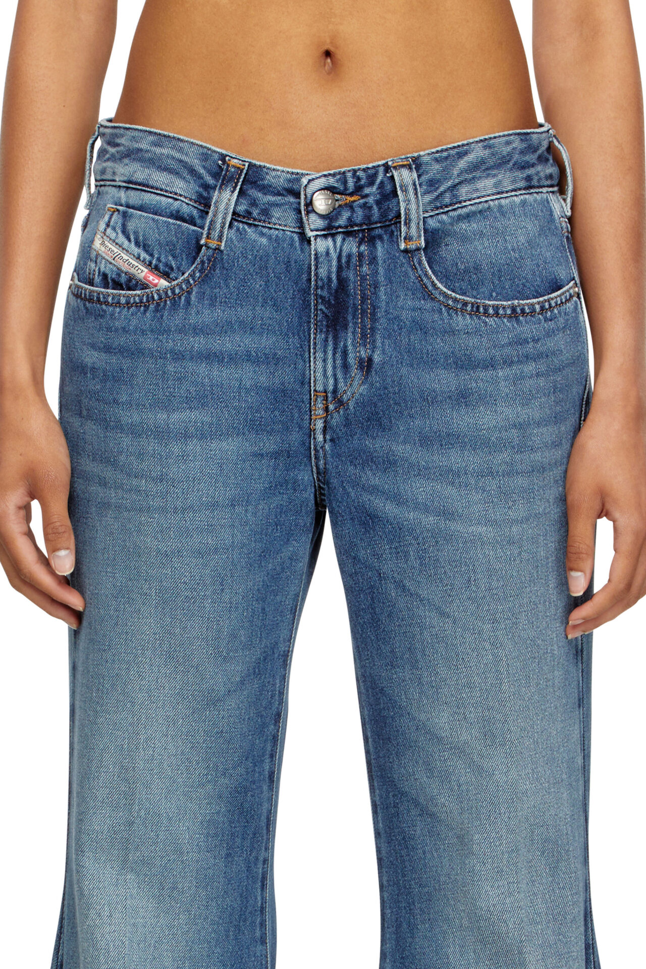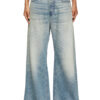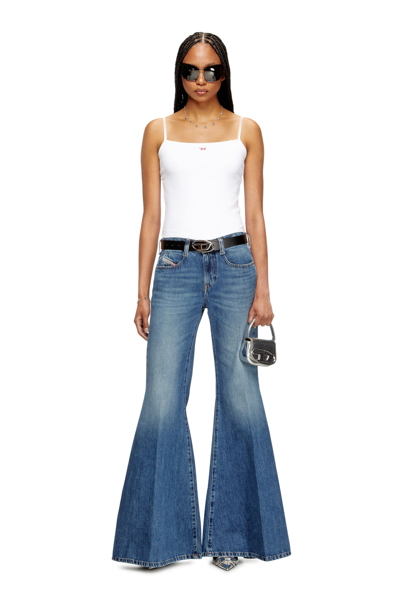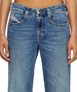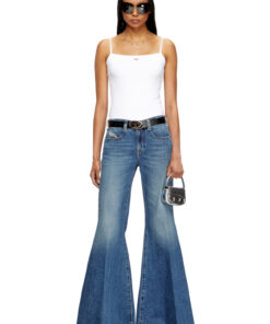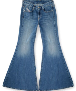 ג׳ינס כחול בגזרה נמוכה ומתרחבת עם רגל צמודה וישרה שמתרחבת באופן דרמטי מהברך ומטה. פרשנות עכשווית לדגם מארכיון דיזל