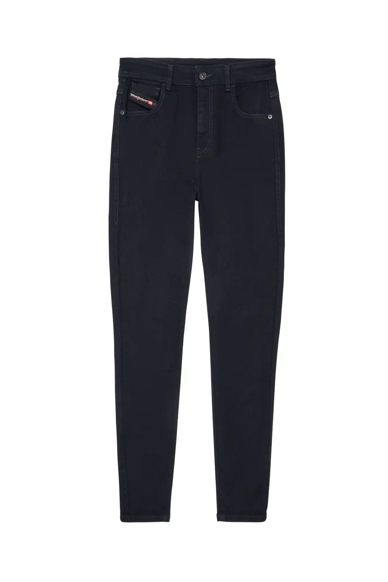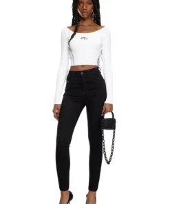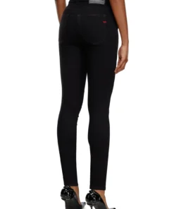 ג'ינס בגזרה צרה גבוהה עם רגל צרה במיוחד עד הקרסול, מבנה המדגיש את קווי הגוף ויוצר סילואטת גוף מודגשת בצבע שחור/אפור כהה