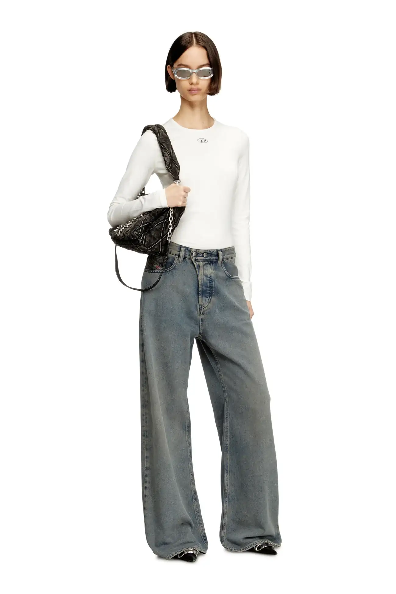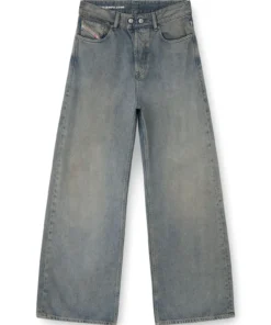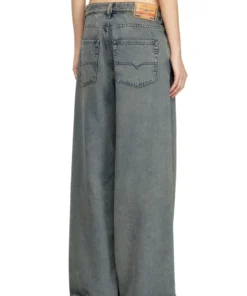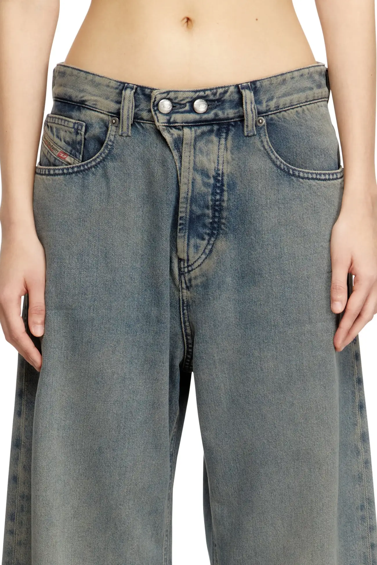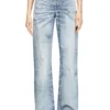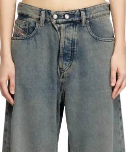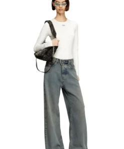 ג׳ינס כחול בגזרה נמוכה, רחבה וישרה בהשראת הגזרות המשוחררות של שנות ה-90, עם סגירת כפתור כפול במותניים