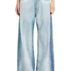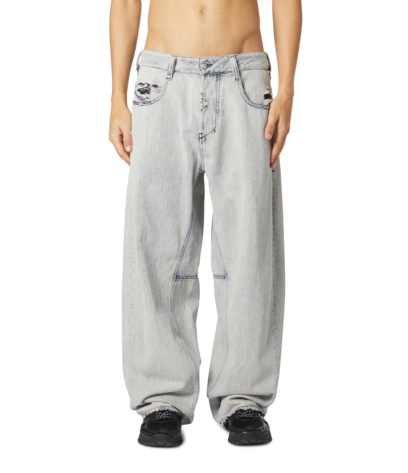 ג'ינס די אנים ג'ינס יוניסקס בגזרה רפויה בצבע כחול בהיר, מותן בינונית עם מפשעה נמוכה ורגל ארוכה ורחבה, תיפורי השראה מעולם הוורקוויר בצד הפנימי של הרגל וסגירת כפתורים