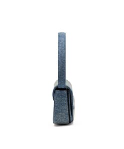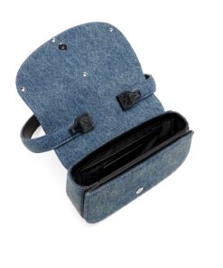 תיק עור ודנים כחול עם ידית לנשיאה ביד, רצועה נוספת לנשיאה אלכסונית ופתיחה קדמית עם אבזם מתכת גדול בצורת לוגו D