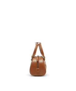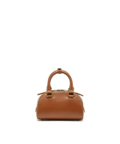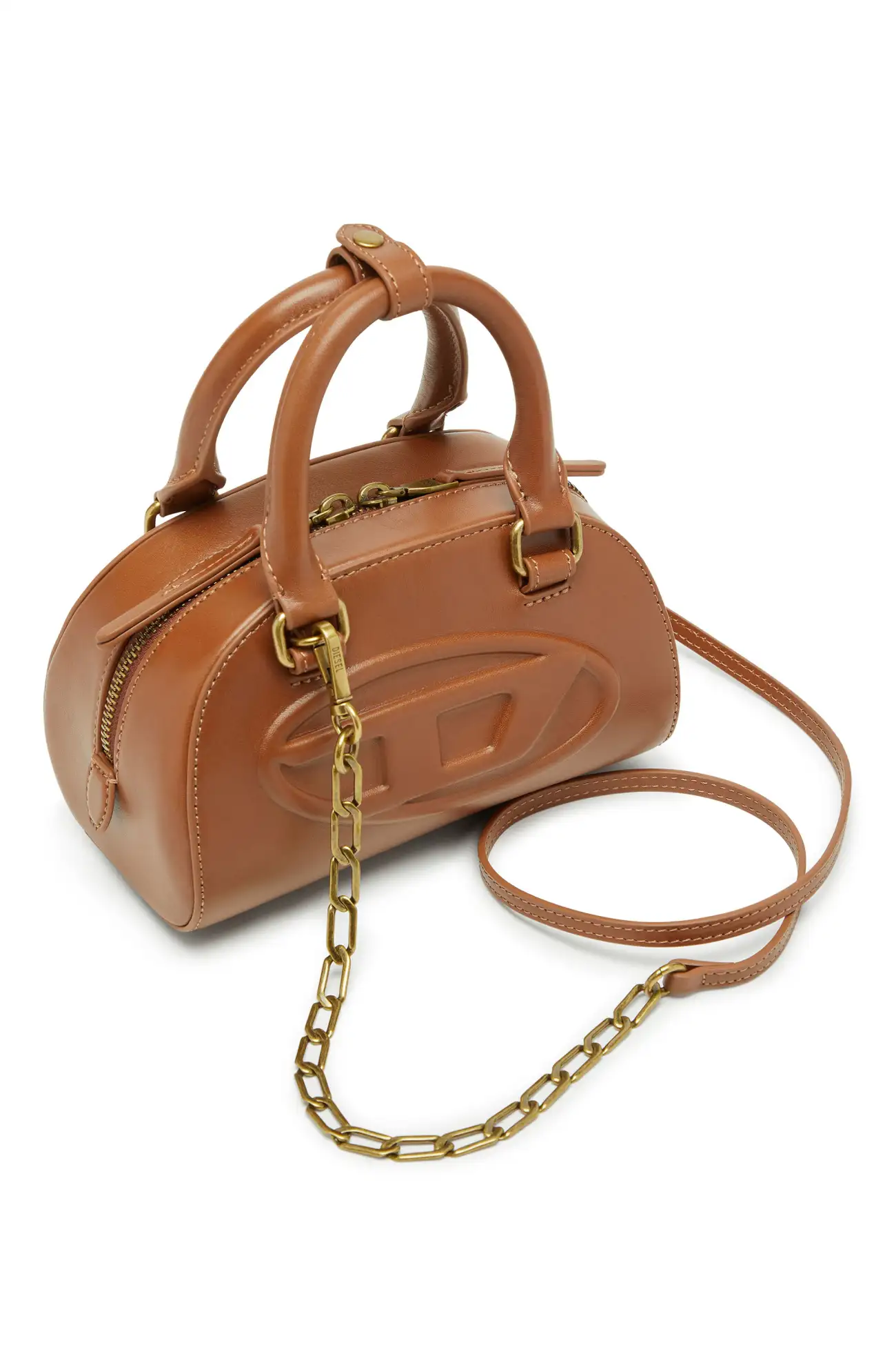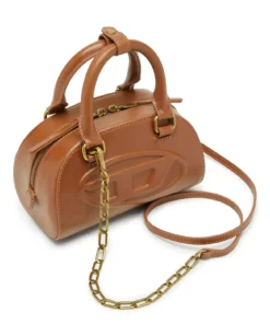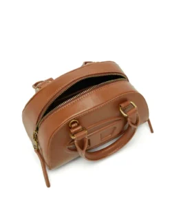 תיק מיני בסגנון באולינג מדגם דום בצבע כאמל, סילואט מעוגלת בהשראת דגם די אר, עשוי עור בגימור מיושן עם פרטי מתכת תואמים, לוגו דיזל מתכתי אובל די מובלט, סגירת רוכסן דו־כיוונית ורגליות מתכת להגנה