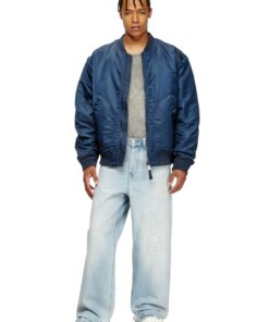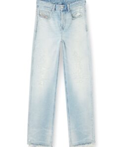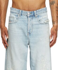ג׳ינס כחול בהיר בגזרה משוחררת ונמוכה, עם מפשעה נמוכה, רגל רחבה וארוכה במיוחד וסגירת כפתורים