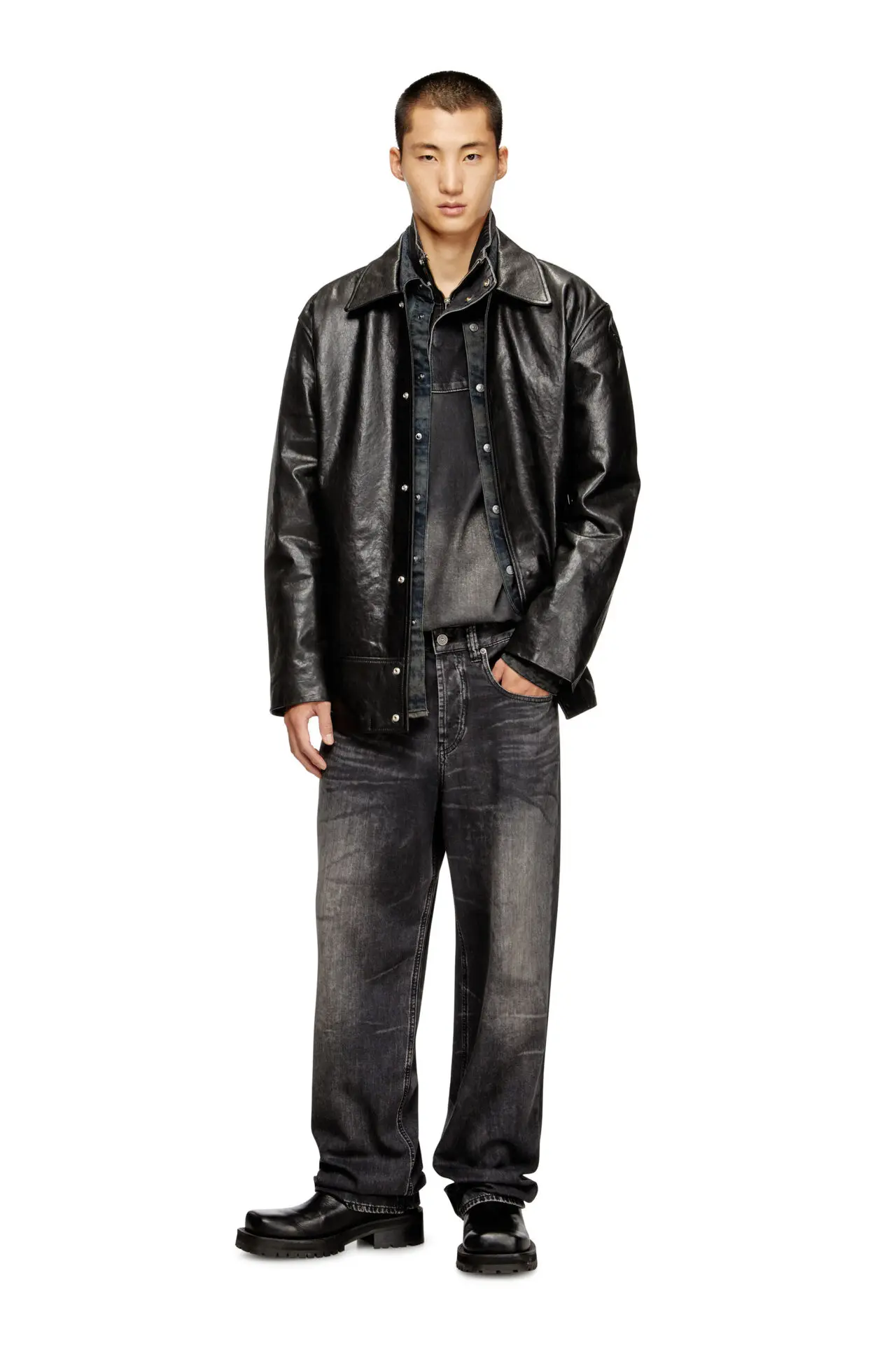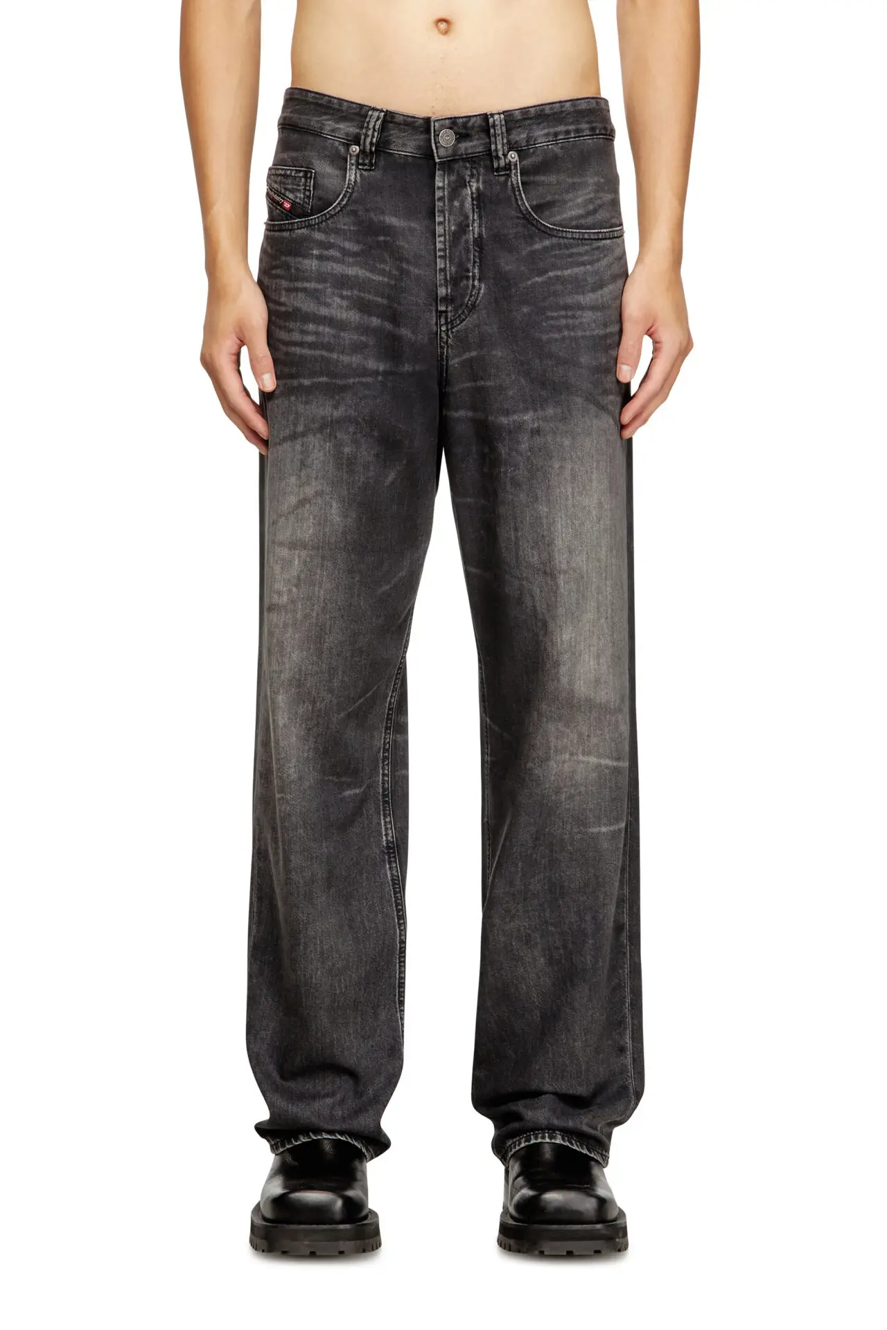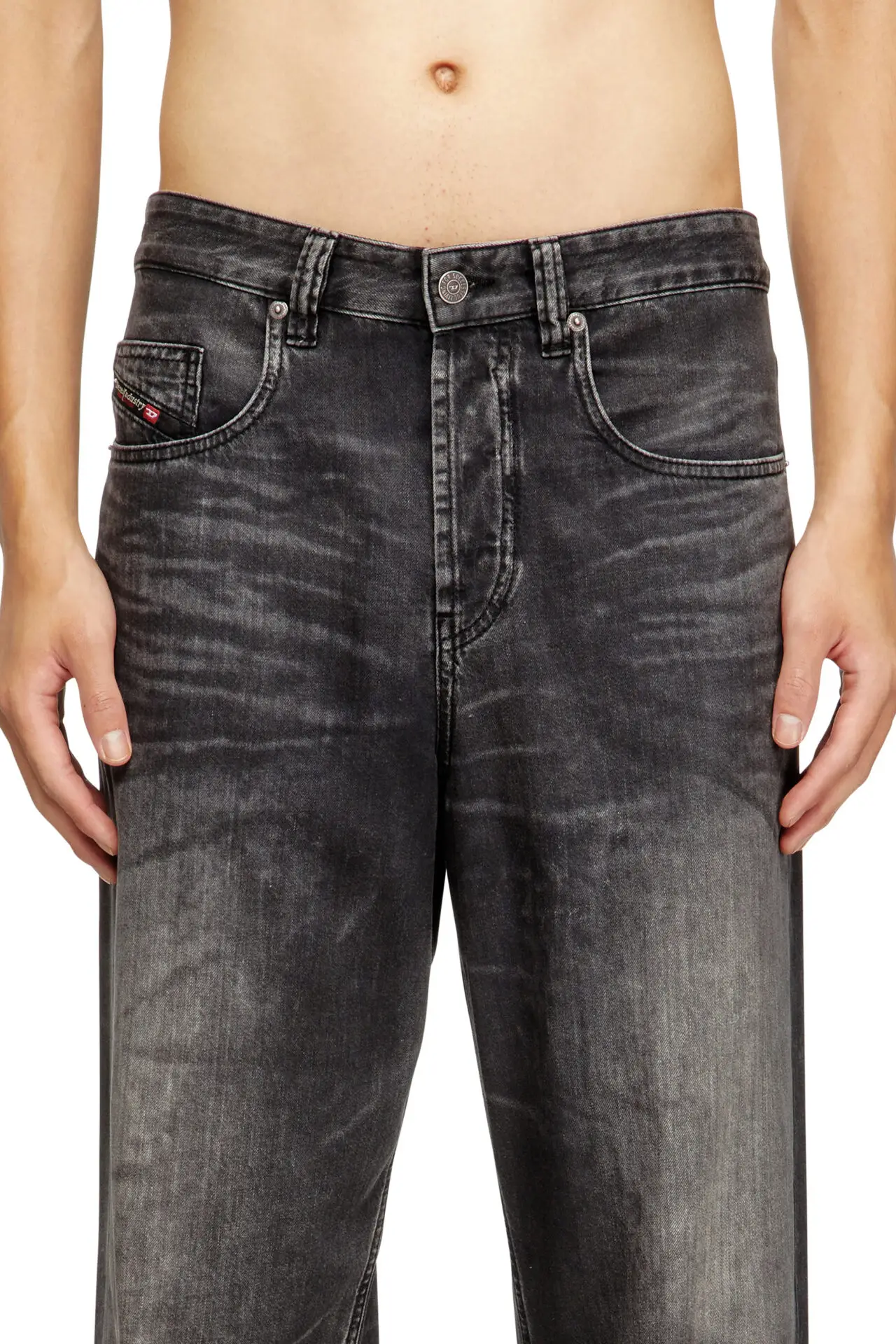 Relaxed fit with a low waist, low crotch, and wide leg. This longer, looser silhouette has room for swagger. Button fly.