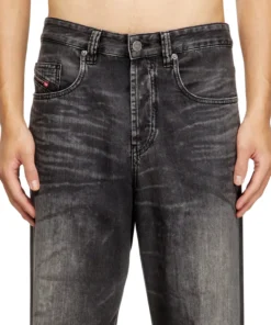 ג׳ינס אפור בגזרה משוחררת ונמוכה, עם מפשעה נמוכה, רגל רחבה וארוכה במיוחד וסגירת כפתורים