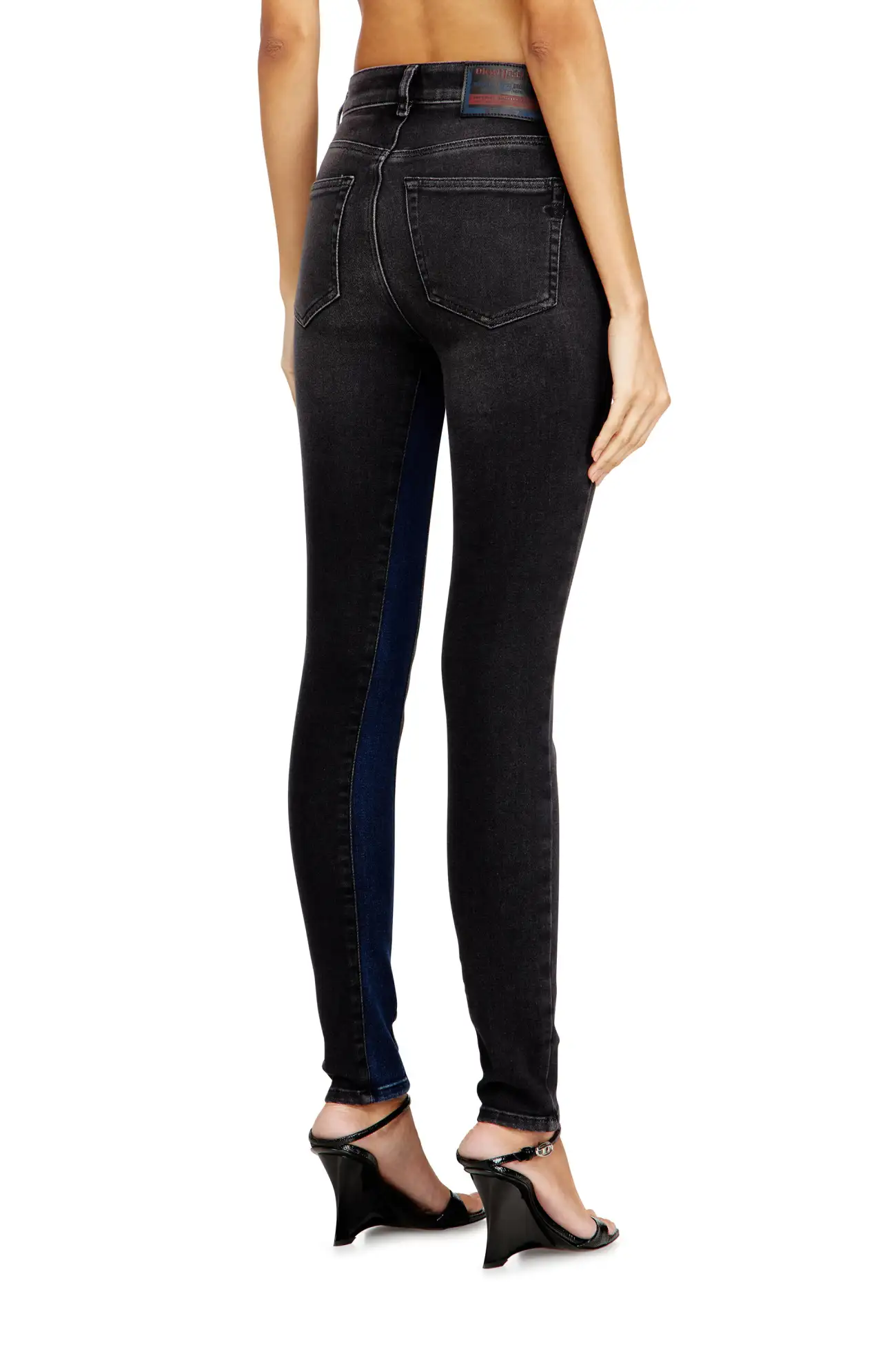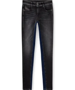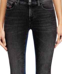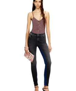 ג׳ינס בגזרה סקיני עם מותן בינונית ורגל צרה במיוחד עד הקרסול בגוון שחור/אפור כהה. הדגם כולל פס משולב בניגוד לאורך התפר הפנימי המאריך חזותית את הרגל.