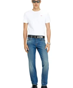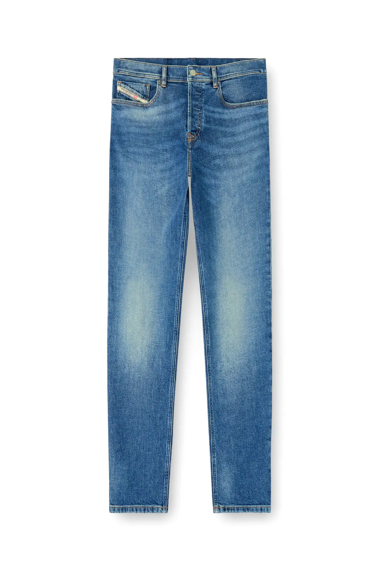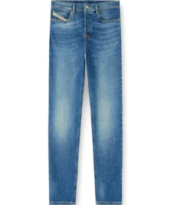 ג׳ינס בגזרה רגילה עם מותן בינונית ורגל מתחדדת מעט, סגירת כפתורים בצבע כחול