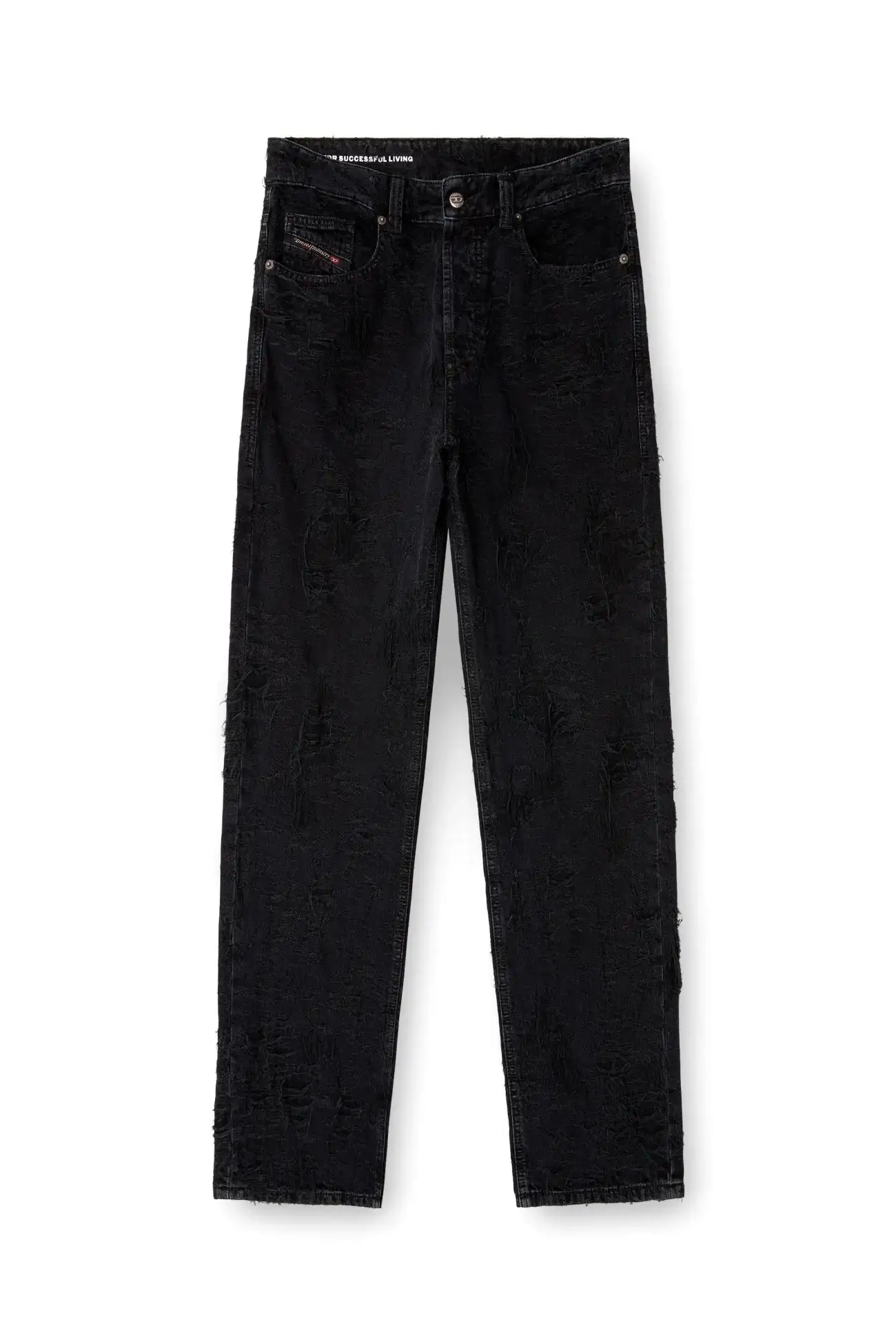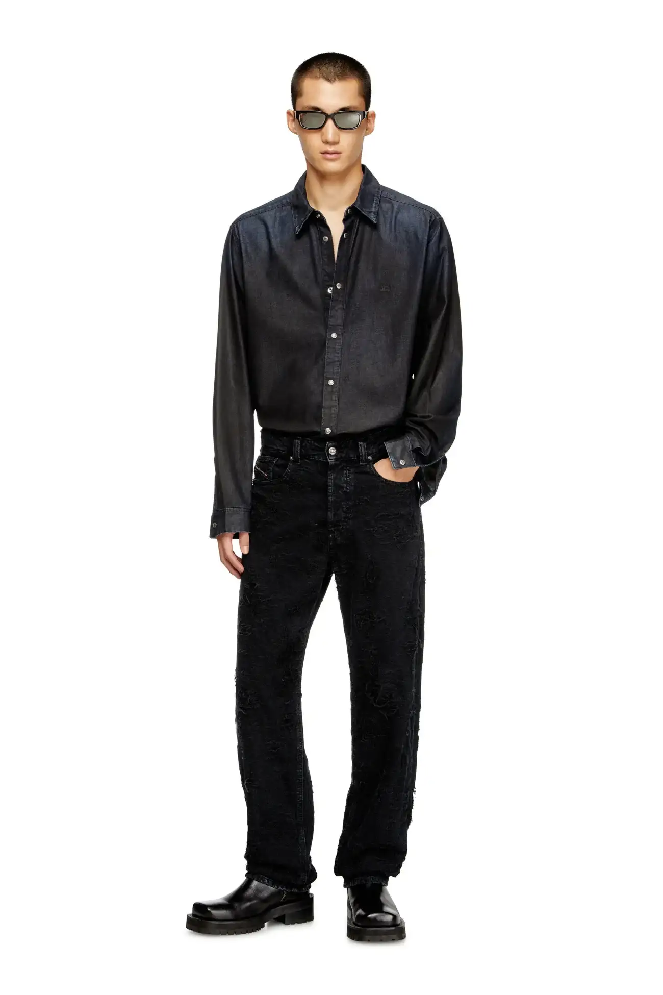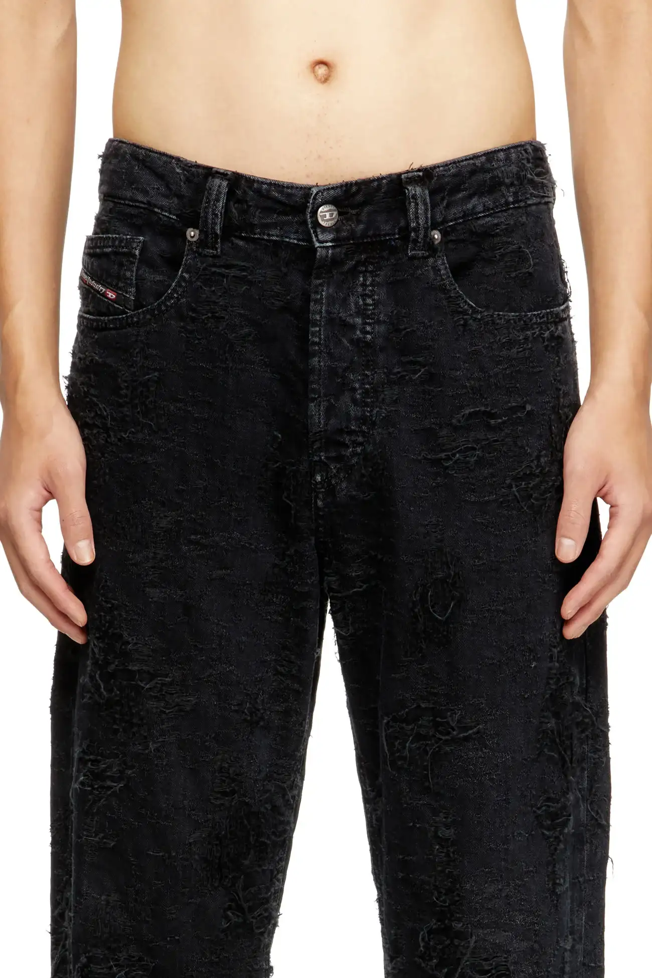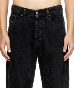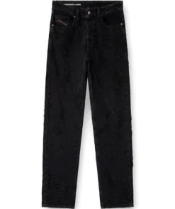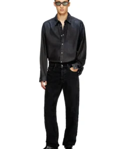 ג׳ינס אפור כהה בגזרה רגילה עם מפשעה נמוכה וסגירת כפתורים, שעבר טיפול פרימה ליצירת טקסטורה ייחודית