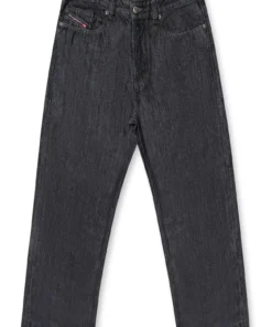 ג׳ינס כחול כהה בגזרה רגילה עם מותן בינונית, מפשעה נמוכה, הצרה קלה בתחתית וסגירת כפתורים