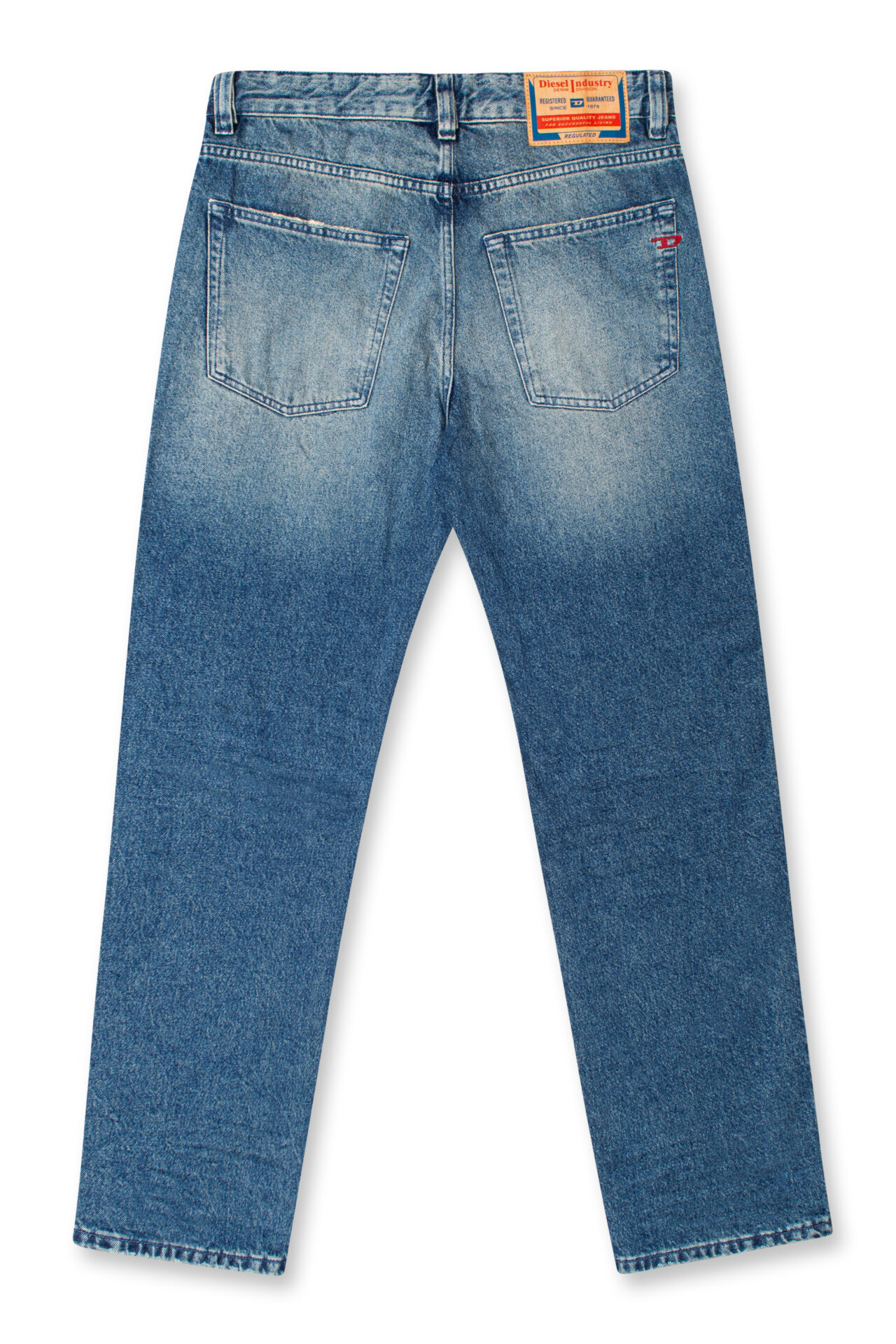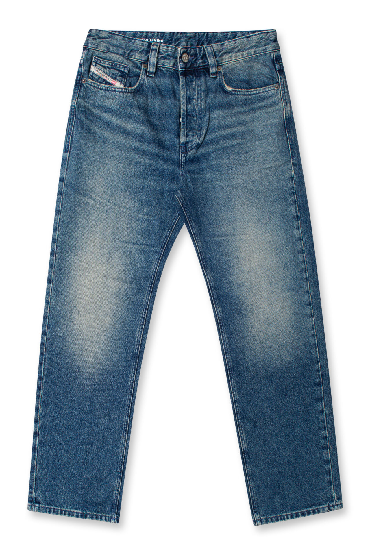 Regular fit with a medium waist, low crotch, and a lightly tapered leg. Button fly.