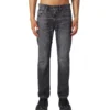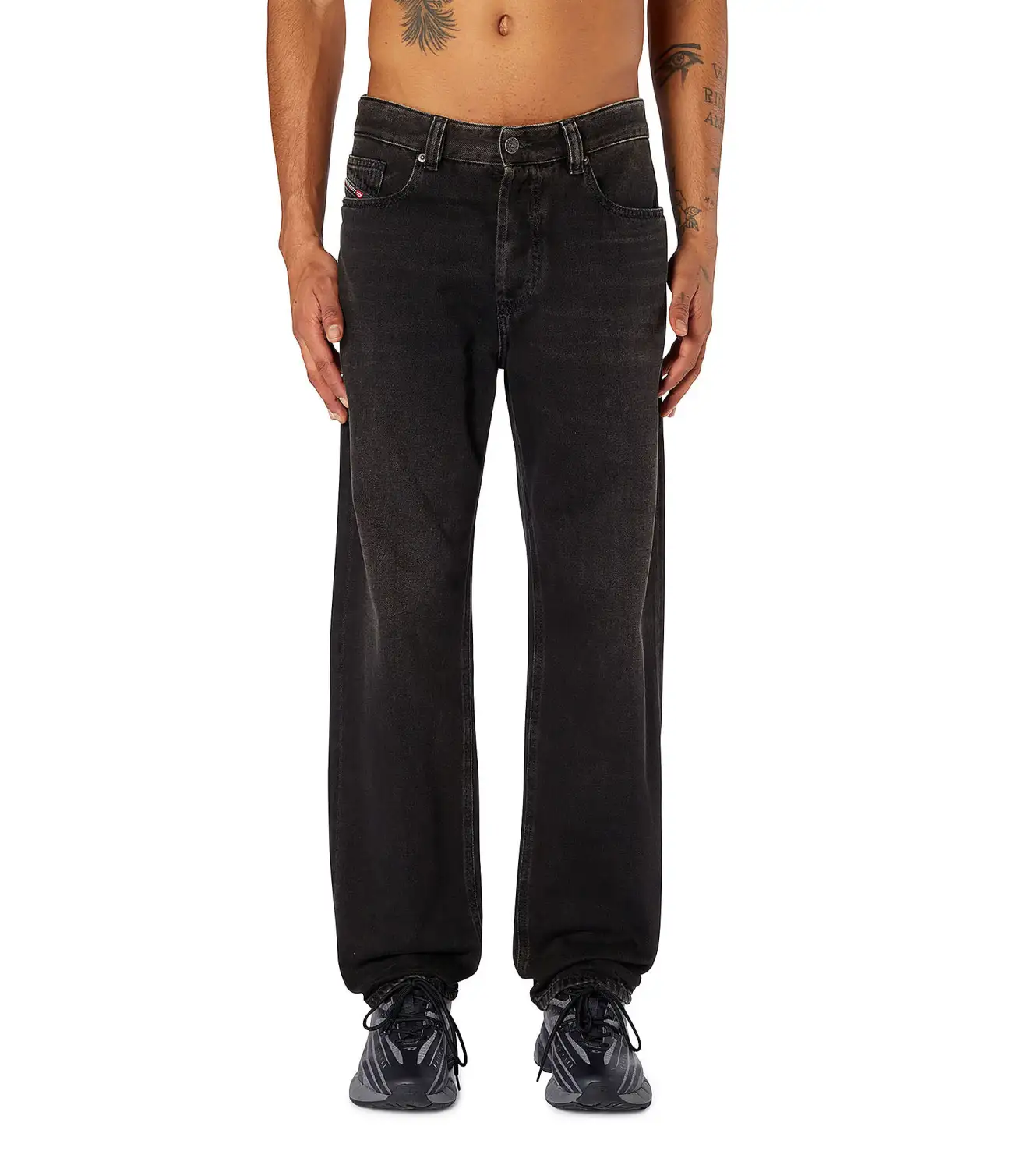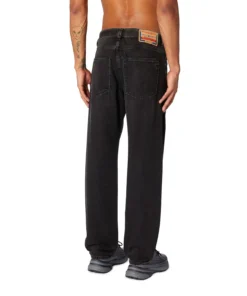 ג׳ינס בגזרה ישרה בדנים שחור/אפור כהה עם מותן בינונית, סגירת כפתורים קדמית ומבנה קווים נקי השומר על צללית מסודרת.
