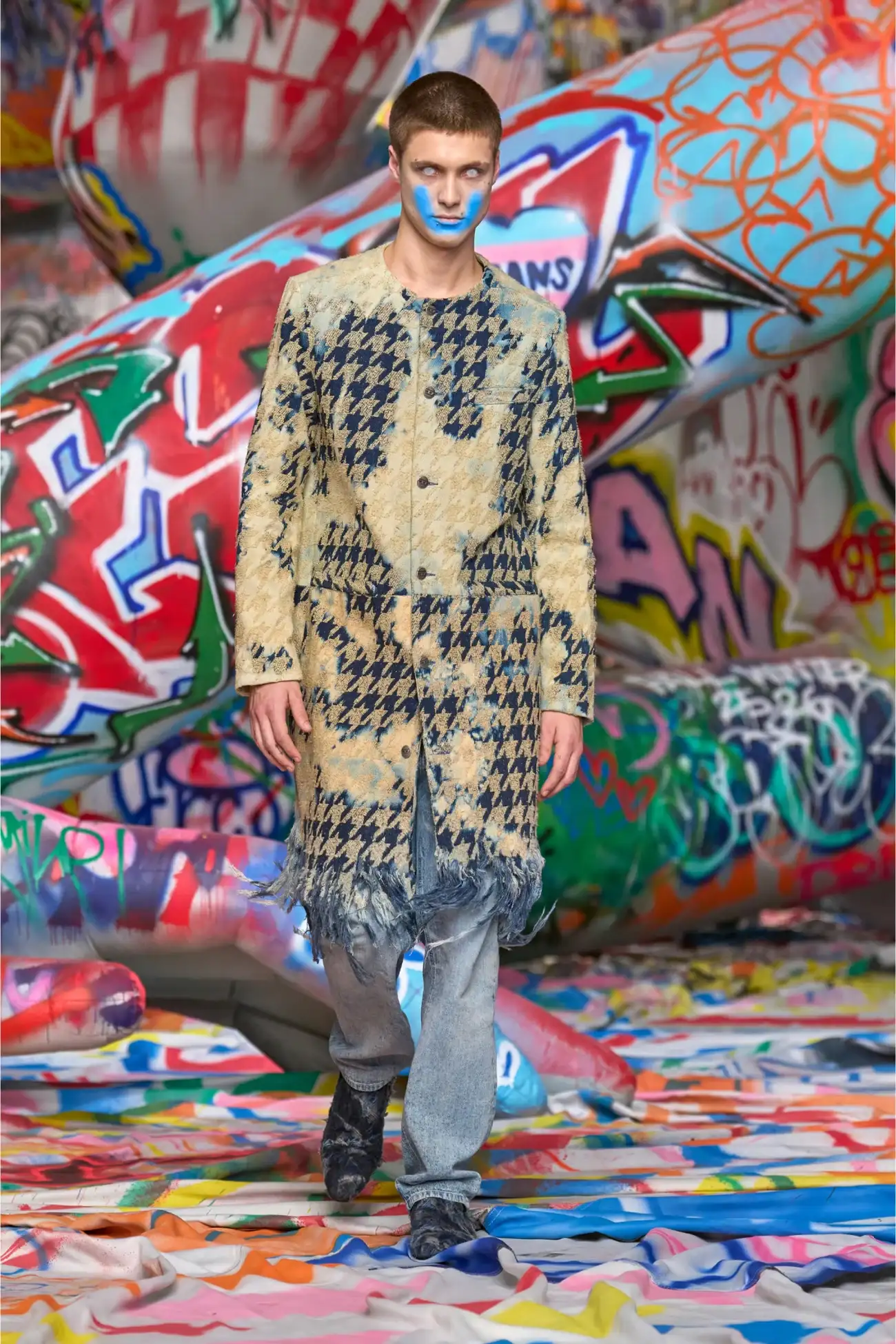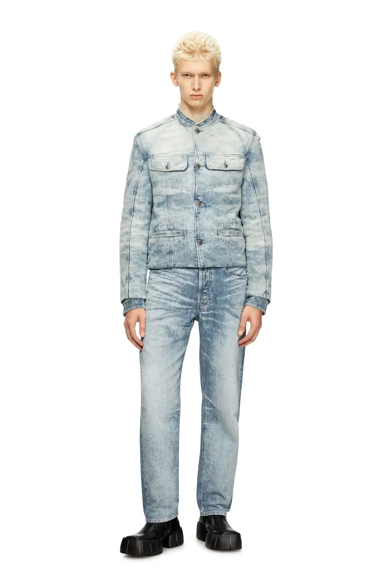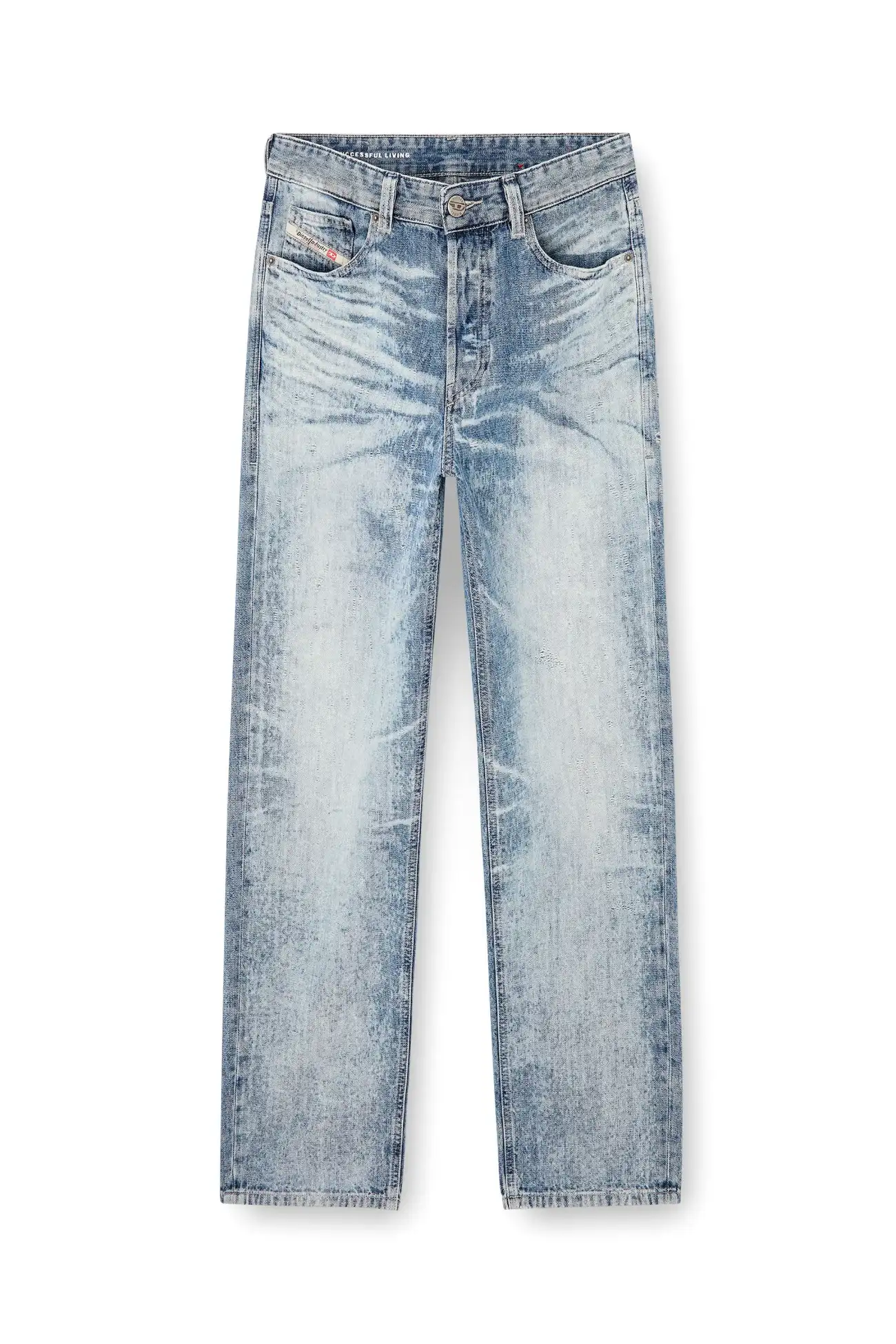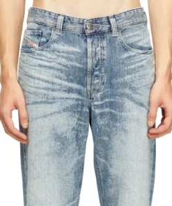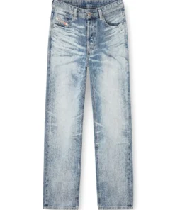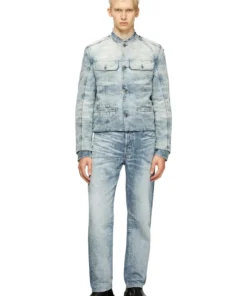 פריט מקולקציית המסלול של דיזל – ג׳ינס כחול בהיר בגזרה רגילה, שעבר טיפול של שטיפה באבנים, התזת אקונומיקה בהתזה וטכנולוגיית לייזר כדי לייצר מראה שחוק בהשראת אריגים יפנים