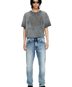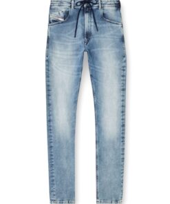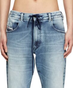 ג׳ינס כחול בהיר מבד ג׳וג ג׳ינס נעים ונוח, בגזרה מעט משוחררת במותניים והירכיים וצרה בקרסוליים, עם גומי ושרוך קשירה
