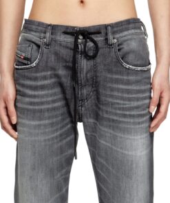 ג׳ינס אפור בגזרה צרה מבד ג׳וג ג׳ינס נעים ונוח, עם גומי ושרוך קשירה במותניים
