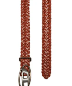 חגורת עור קלועה עם אבזם לוגו אובלי בגימור מט ברוחב 4 ס"מ בצבע חום