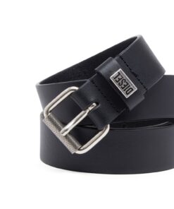 This men's belt is cut from plain black leather. Fastening with a roller buckle, it features a Diesel For Successful Living metal plaque on the belt loop.
