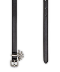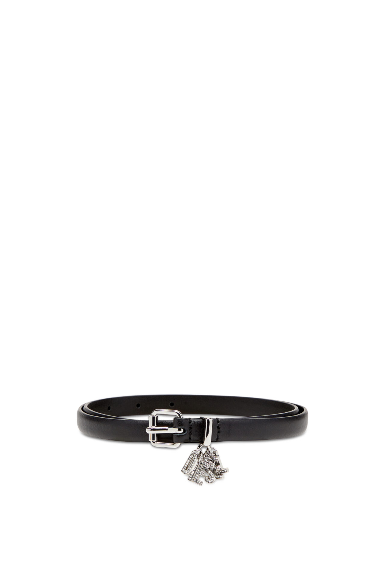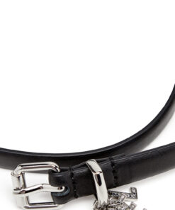 חגורת עור דקה בצבע שחור עם אבזם ולולאה כסופים ממתכת ותליוני אותיות לוגו קטנים משובצים קריסטלים