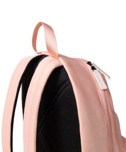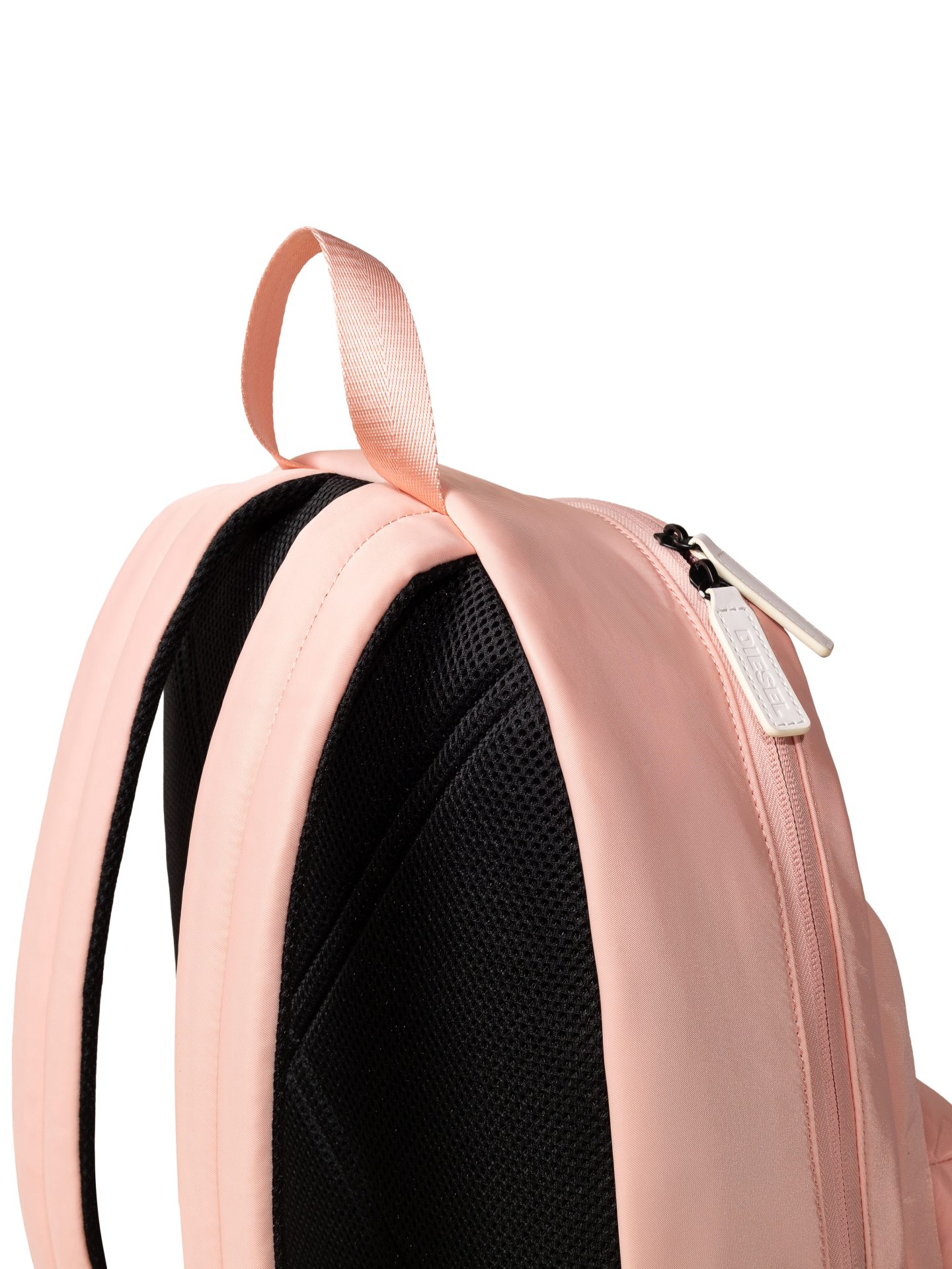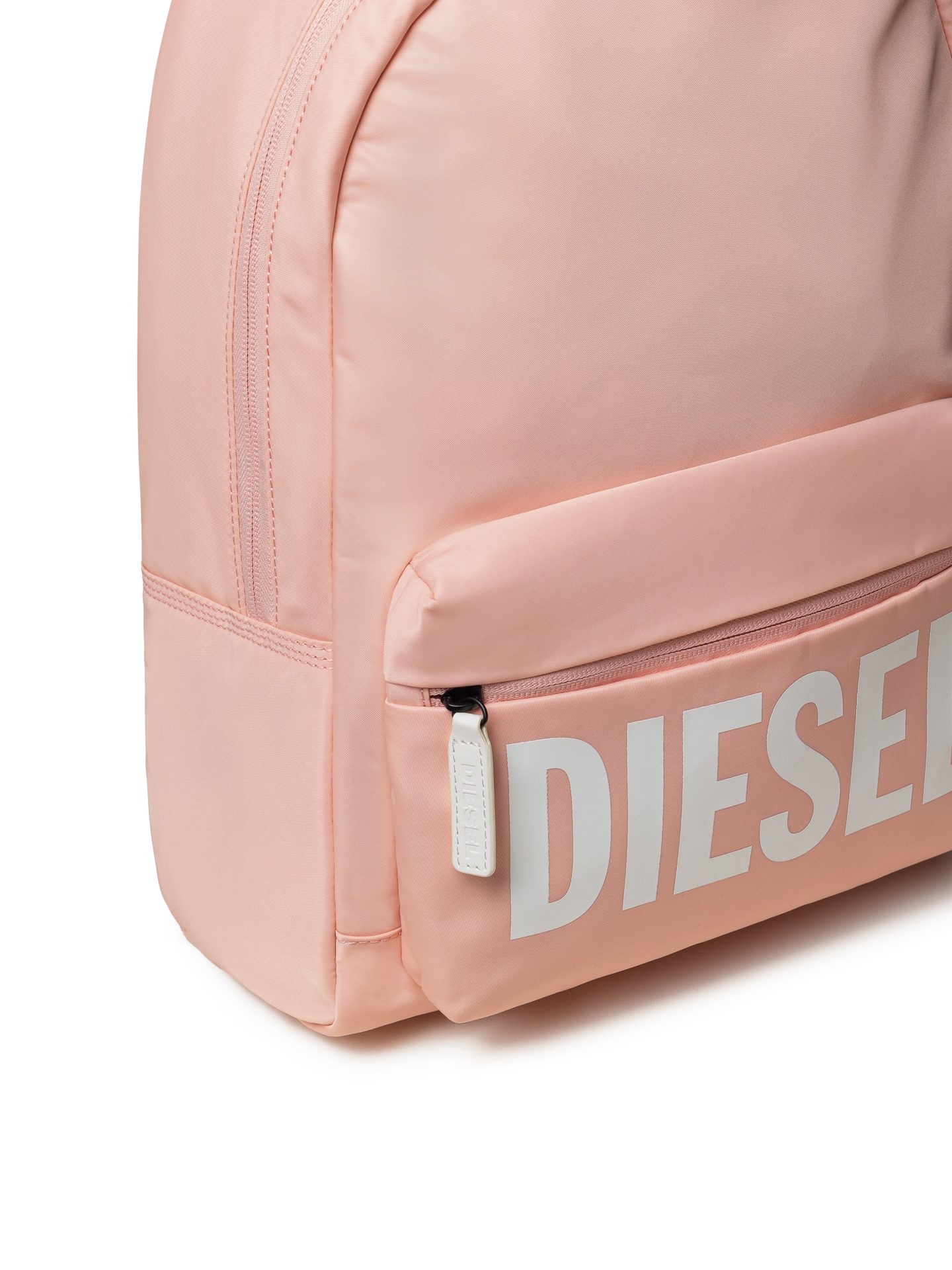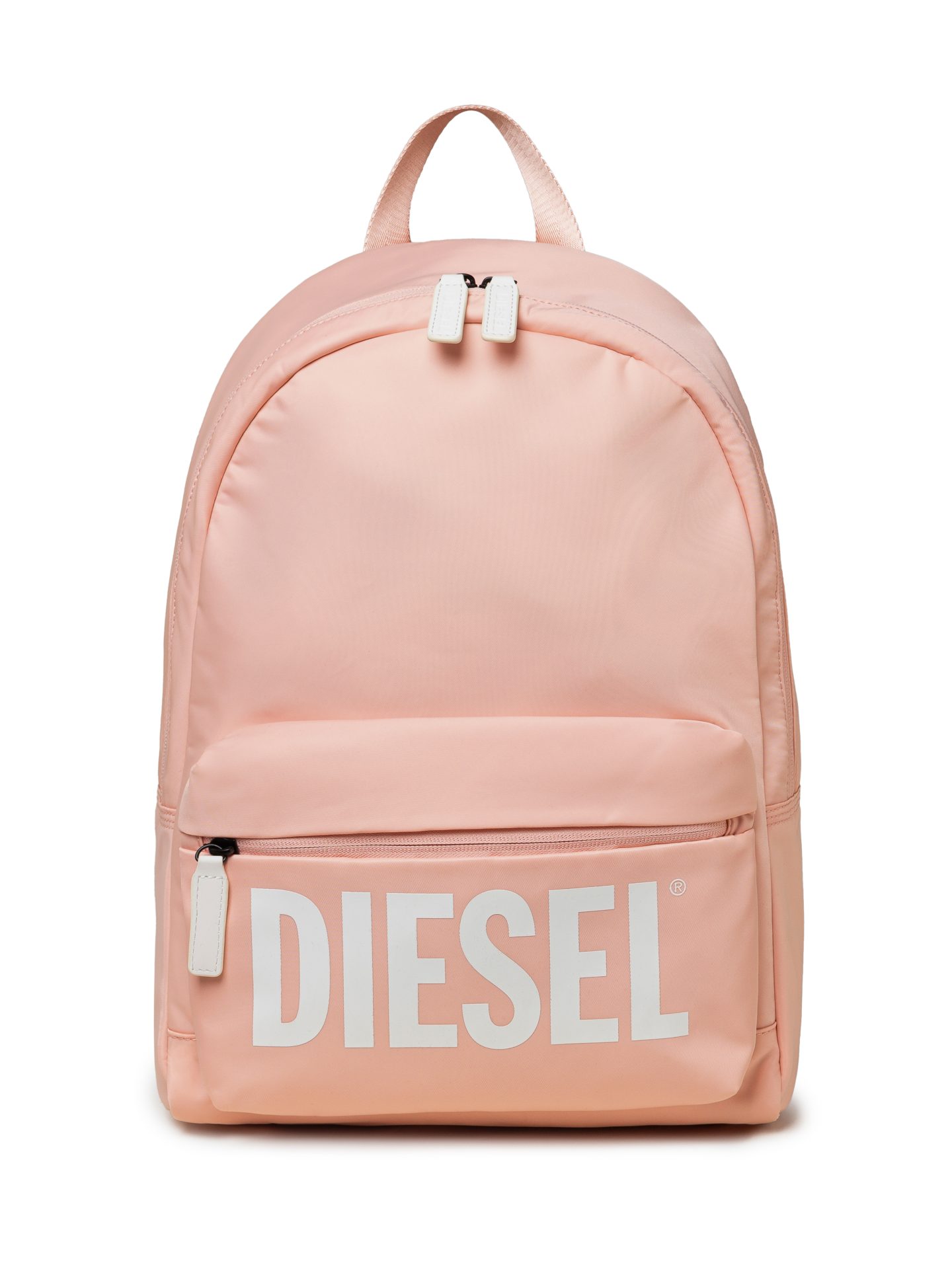 תיק גב ורוד מבד ניילון עמיד, עם סגירת רוכסנים, ריפוד בכתפיות ובגב והדפס לוגו דיזל בצבע לבן