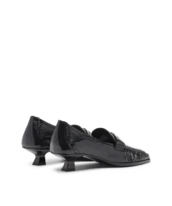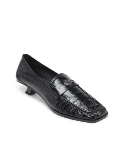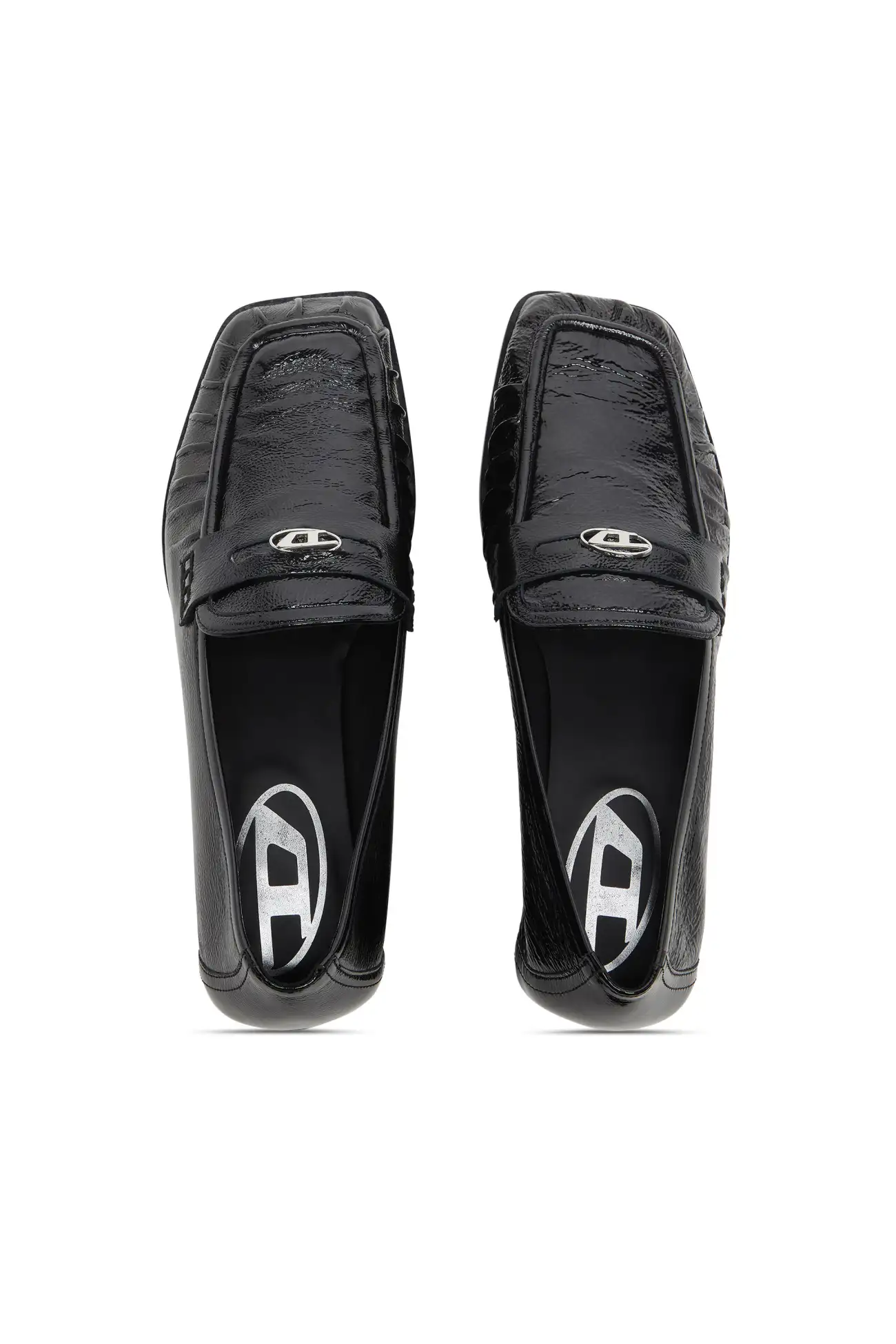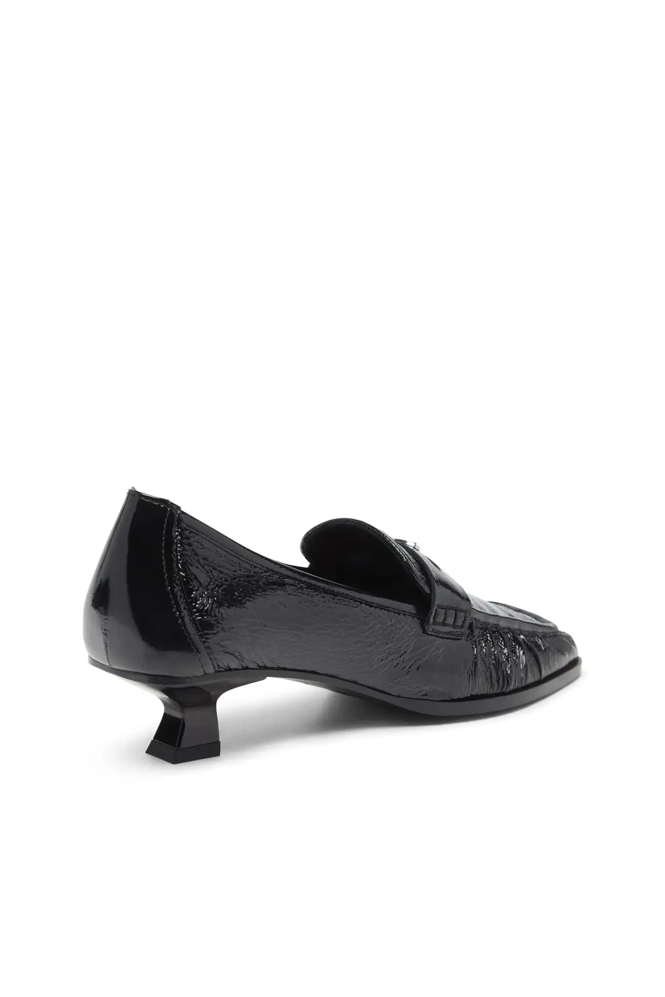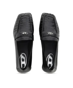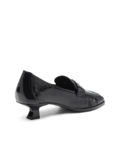 לופרס נשים בצבע שחור עשויות עור נאפלק מבריק במראה מקומט, עם רצועת פני משודרגת בלוגו די אובאלית מתכתית ועקב מחורץ בגובה 3 ס״מ למראה אלגנטי ונוח