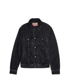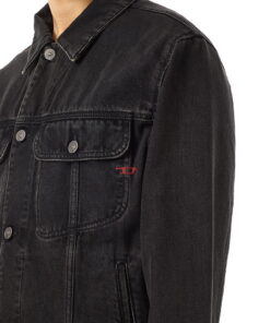 ג׳קט דנים שחור בגזרת טראקר עם כפתורים כסופים, כיסים בחזה ורקמת לוגו D אדומה