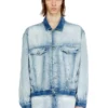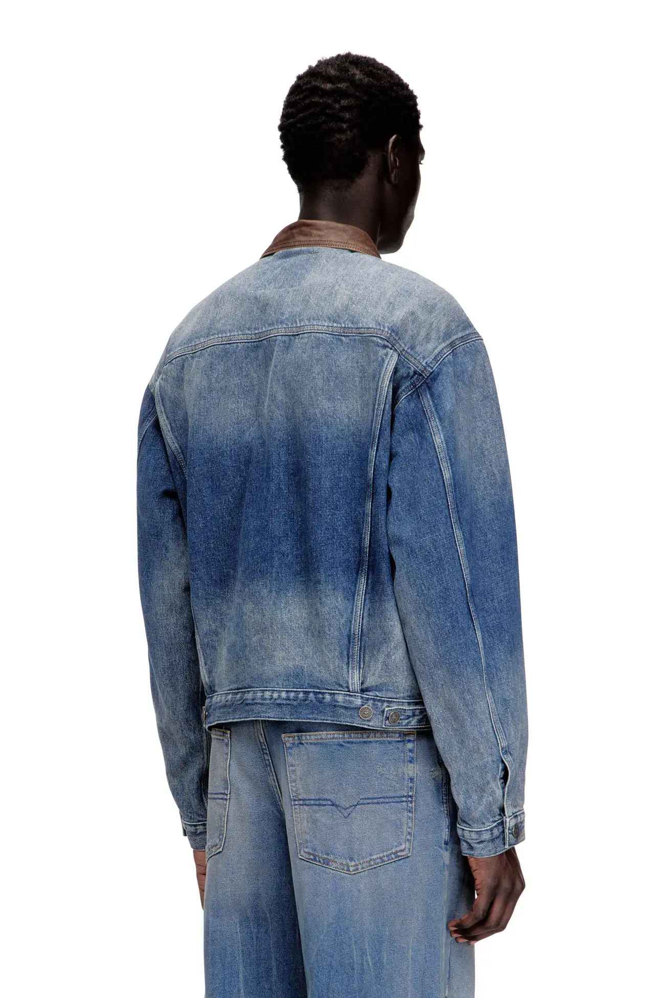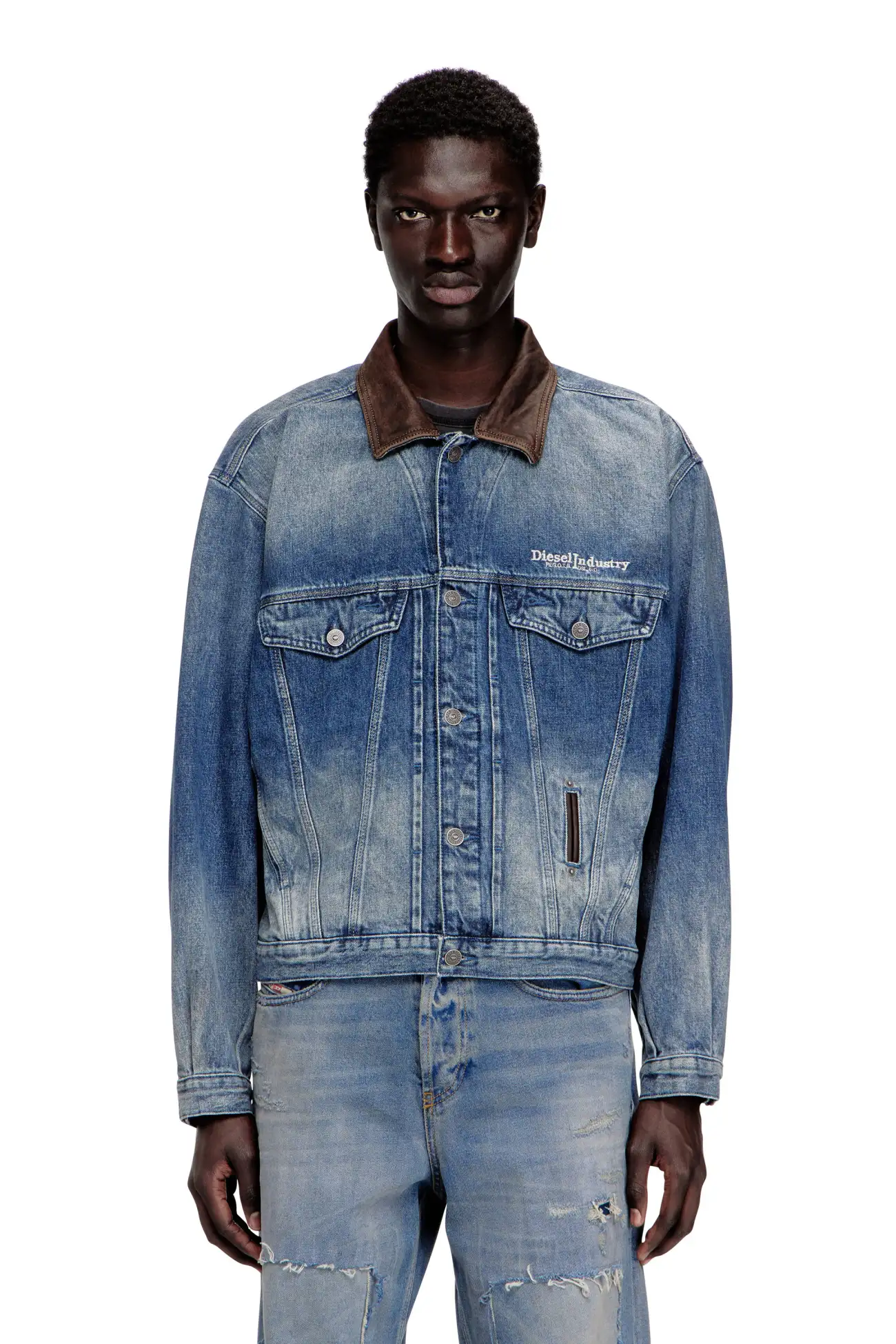 This trucker jacket reimagines an archival design. The '80s aviator-inspired silhouette is characterised by oversized shoulders and slim, slightly cropped hem. It's crafted from medium blue cotton and hemp denim for a raw look and feel, stonewashed and treated with bleach effects. The contrasting brown leather collar and white embroidered Diesel Industries logo fuse a retro attitude with contemporary edge.