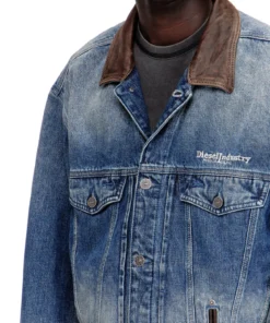 ג'קט דנים טראקר עם צווארון עור בניגוד – כחול