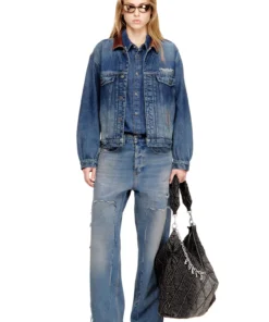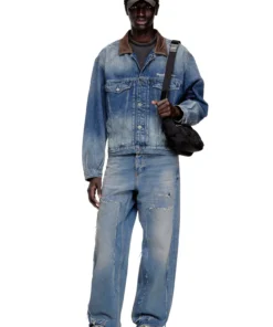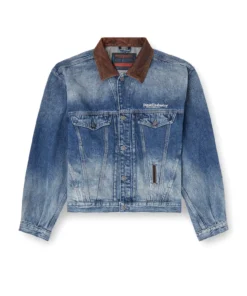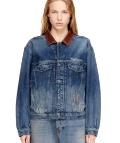 ג'קט דנים טראקר בגזרה קצרה עם כתפיים רחבות בהשראת שנות ה-80, עשוי דנים כותנה וקנבוס בגימור שטיפה וטיפולי בליץ', עם צווארון עור בניגוד ורקמת לוגו בצבע כחול