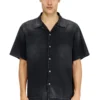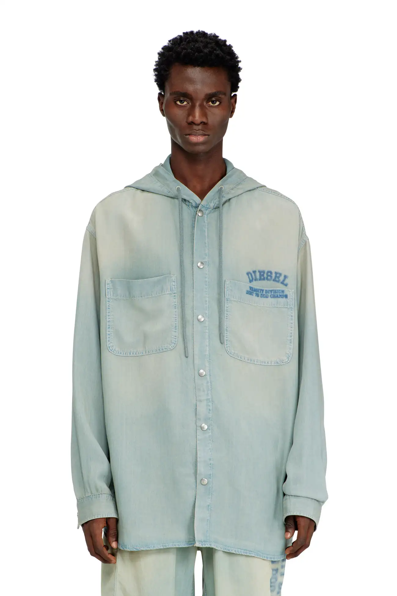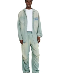 אוברשירט דנים בצבע כחול בהיר מדנים נשפך עם אפקט dirt, מעוצב עם קפוצ'ון קל וצללית ארוכה עם מכפלת מעוגלת