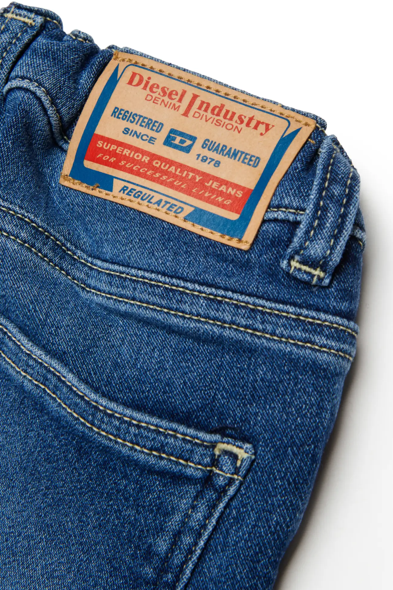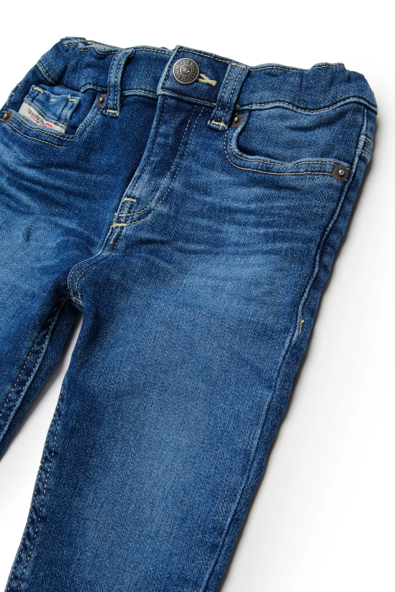 ג'וג ג'ינס לילדים בגזרה רגילה עם מבנה חמישה כיסים, תפרים גלויים, פאץ' אחורי וכפתור ממותג בצבע כחול בינוני