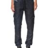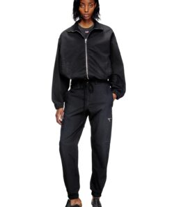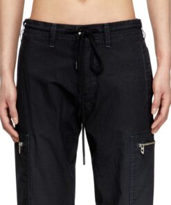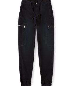 ג׳ינס שחור בגזרה צרה, עשוי בד ג׳וג ג׳ינס נעים ונוח, עם שרוך קשירה במותניים וכיסים עם רוכסנים בצדי הרגליים