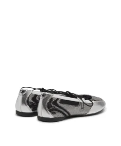 נעלי בלט לנשים בגימור כסוף חלק וסדוק בצבע כסף/שחור, מבנה פאנלים עם סוליה גמישה ונוחה, שרוכי בנג׳י ספורטיביים לקשירה או כריכה סביב הקרסול, פרטי זיגזג ולשונית אחורית עם הדפס לוגו