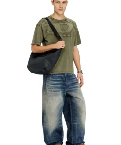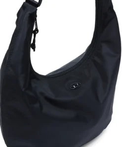 תיק כתף מבד טכני עם רצועה מתכווננת וסגירת רוכסן מתכת. בחזית לוגו אובל D מתכתי טונאלי ובפנים כיס רוכסן אחורי בצבע שחור