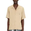 חולצת דנים בגזרה רחבה בצבע כחול מבד כותנה אורגנית, עם שפשופים בקולר ובחלק הקדמי, כיסי פאץ׳ בחזה ורקמת לוגו למראה מובחן