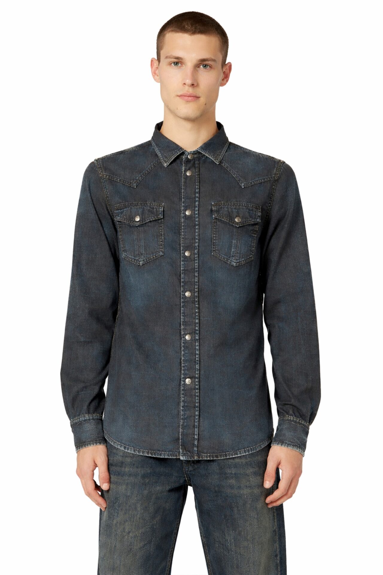 Denim shirt made from 100% organic cotton in a medium blue wash, featuring abrasions on the collar and front yokes. The design features long sleeves and a front button closure, while the two patch pockets on the chest add style and functionality. The embroidered logo on the front pocket provides a distinctive touch.