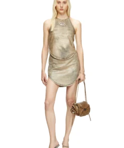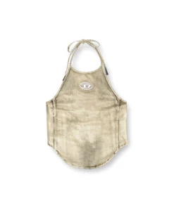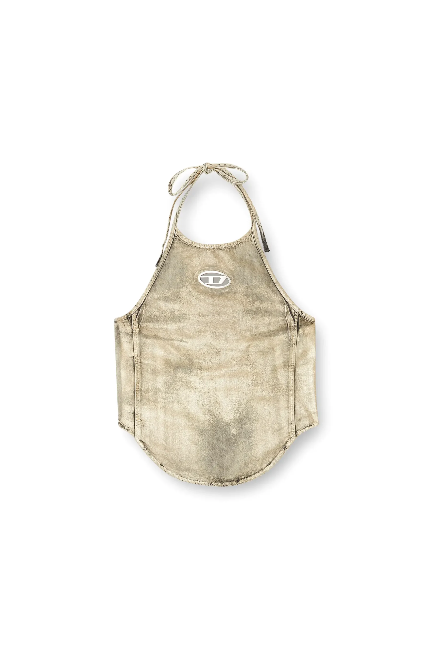 This women's halterneck top features slim straps and an open back. The metal Oval D plaque on the chest is detailed with skin-baring cut-outs. It's crafted from a lightweight black denim that reimagines Diesel’s heritage washes with a party-ready twist. The graphic, shimmering whisker effect is achieved through laser detailing that removes parts of the gold Mylar. The result is an interplay of light and texture, blending authentic denim character with a statement finish.