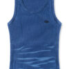 גופיית קולר מבד דנים כותנה וליוסל קל ונעים בצבע כחול בהיר עם מראה משופשף וציפוי מטאלי למראה מעט מבריק. לגופייה סיומת מעוגלת, כתפיות קשירה דקות ולוחית לוגו D במרכז החזה שחושפת את העור מתחת