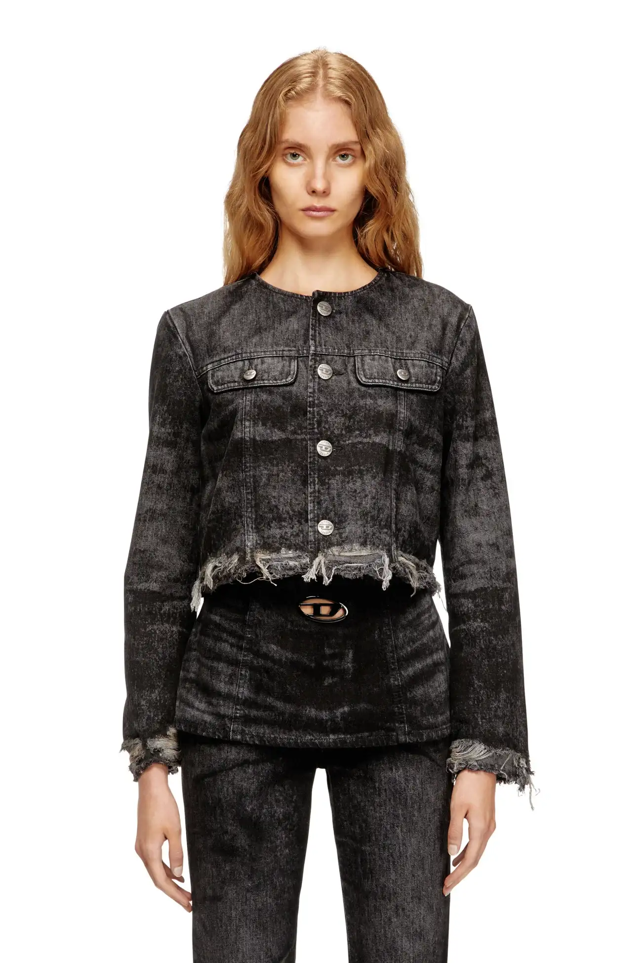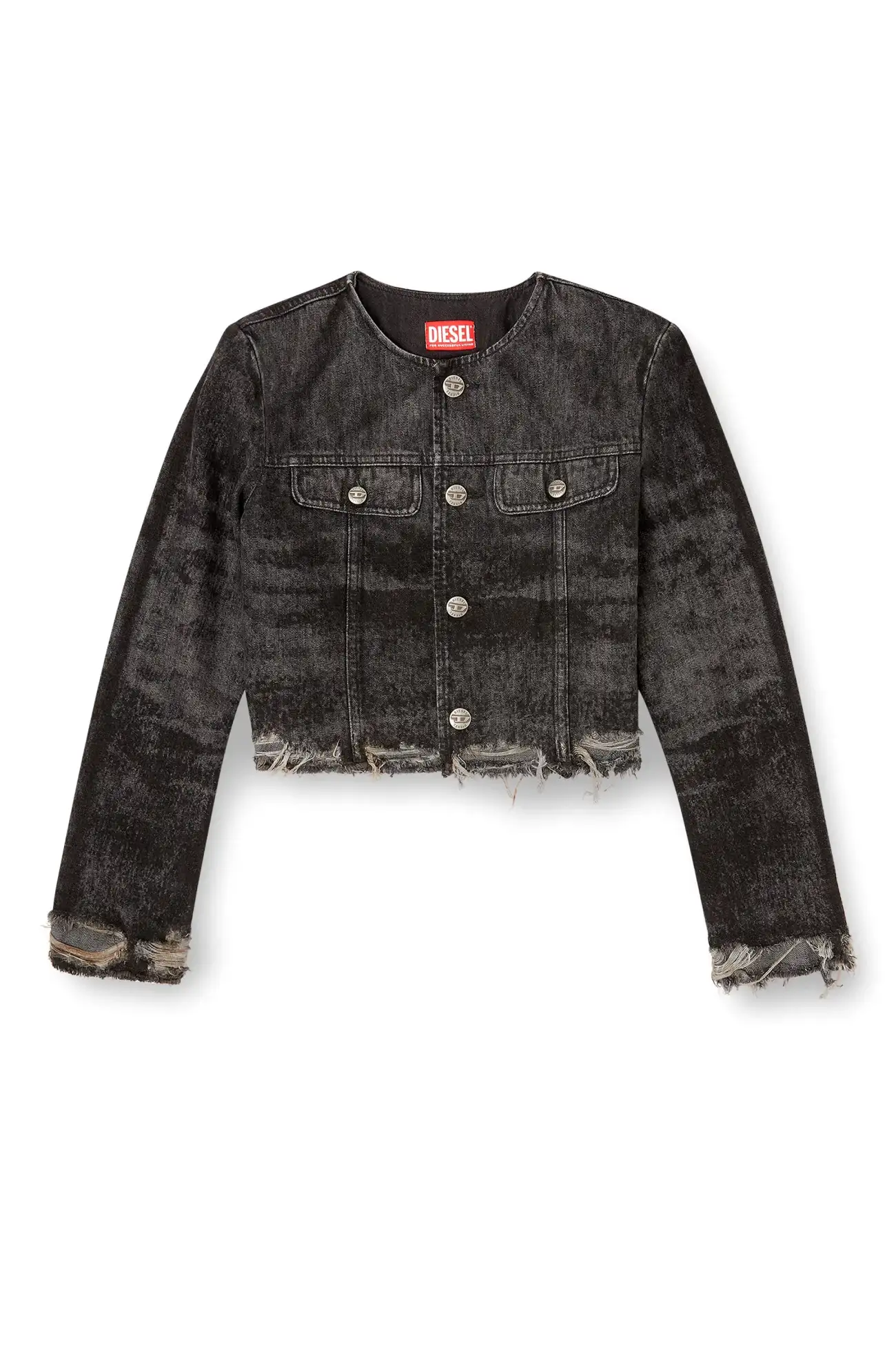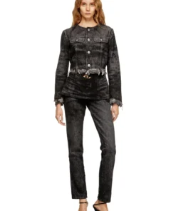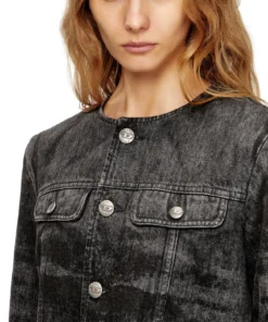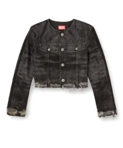 פריט מקולקציית המסלול של דיזל – ג׳קט דנים אפור כהה בגזרת טראקר ללא צווארון, באורך קרופ עם שוליים קרועים ופרומים