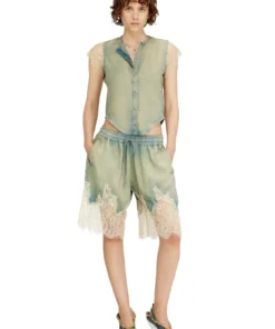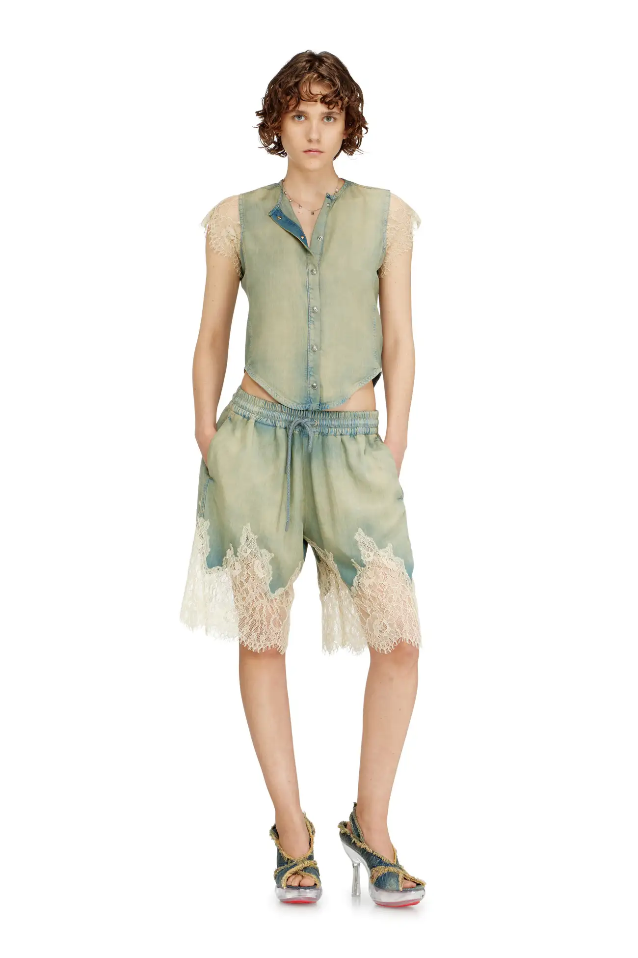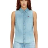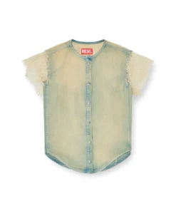 This women's top is crafted from fluid TENCEL Lyocell denim in a dusty light blue wash that nods to Diesel's DNA style codes. Delicate lace inserts on the shoulders fit like short cap sleeves. Finished with a full-length snap button closure.