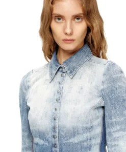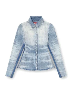 פריט מקולקציית המסלול של דיזל: חולצת דנים בצבע כחול, בגזרה מחויטת עם כפתורי סנאפ מט וריב אלסטי בשרוולים לנוחות וגמישות