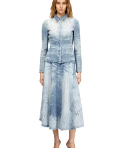 Seen on the Fall Winter 2025 Runway, this women’s denim shirt is cut to a fitted silhouette, with matte metal snap buttons and stretchy rib inserts on the sleeves for flexibility and comfort.