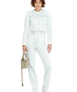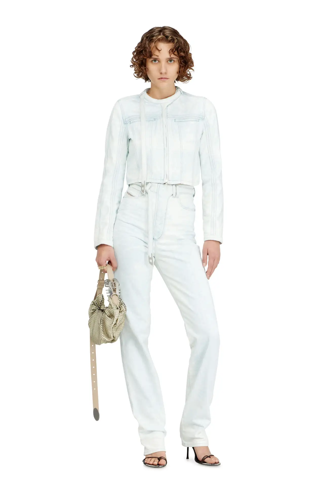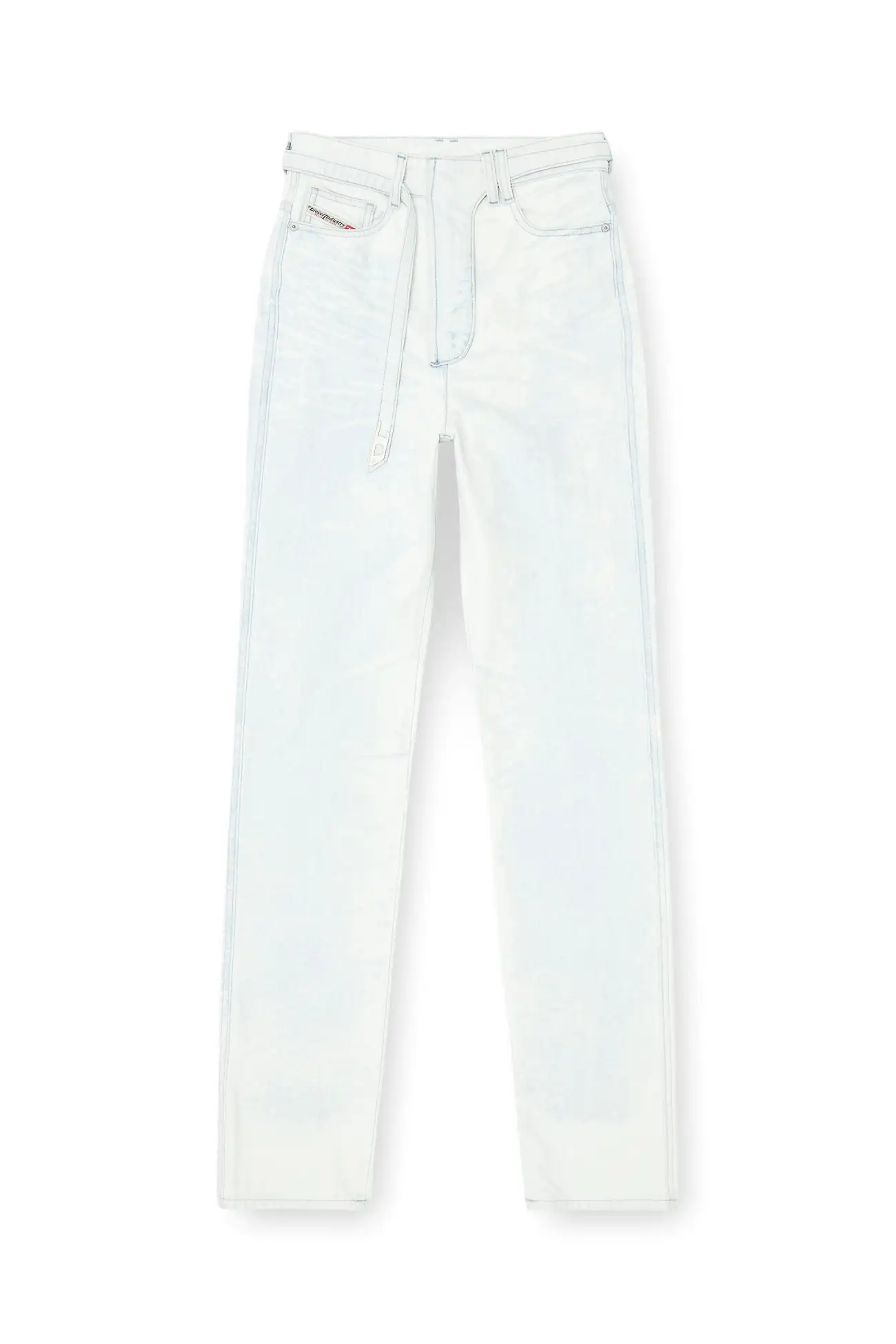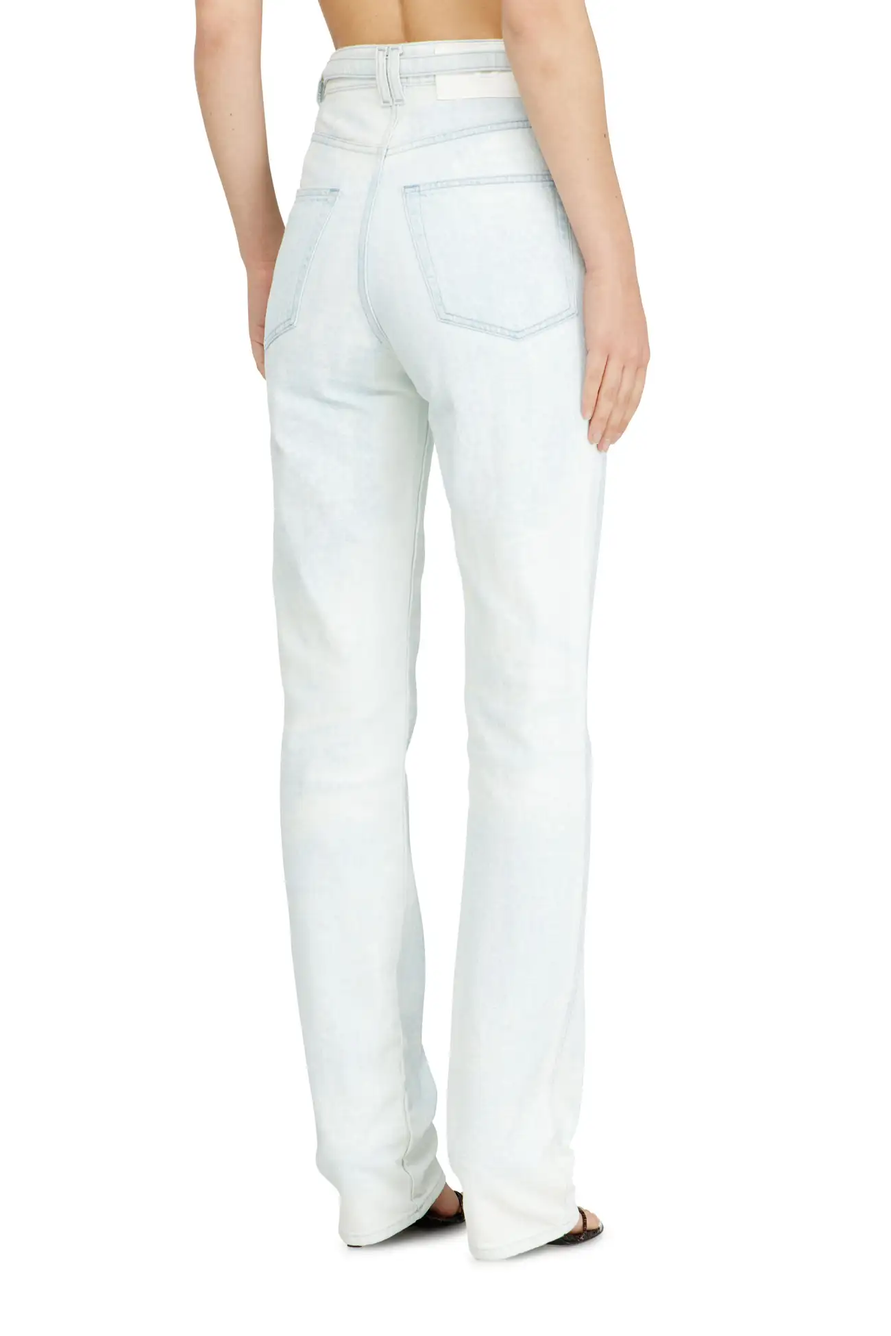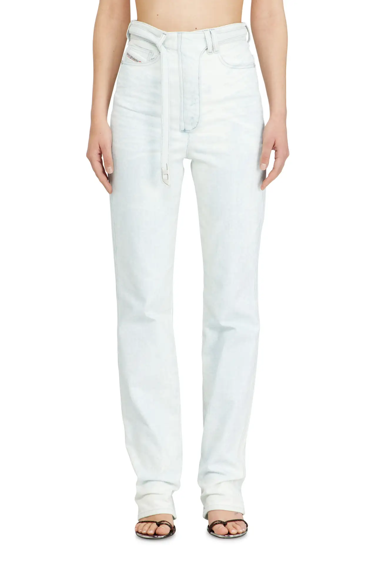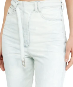 ג'ינס בצבע כחול בהיר בגזרה צרה עם מותן גבוהה מאוד, חגורה דמוית אופנוען מפורקת עם לוגו D מתכתי בקצה ולולאות חגורה מרובות