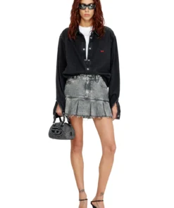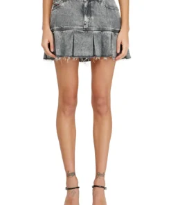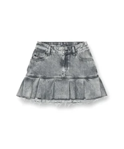 Denim mini skirt characterized by a pleated hem with frayed details. Crafted from fix denim with a percentage of organic cotton with a marbled wash and a cool, lived-in attitude.