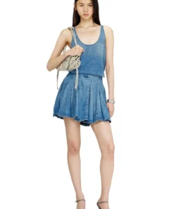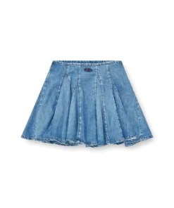 חצאית מיני מדנים קל משקל בצבע כחול בהיר בגימור סטונווש, מעוצבת בצללית מתרחבת עם קפלים מובנים, עשויה תערובת כותנה וליוסיל למגע רך ונשפך, משלבת לוגו אובלי חתוך בחזית