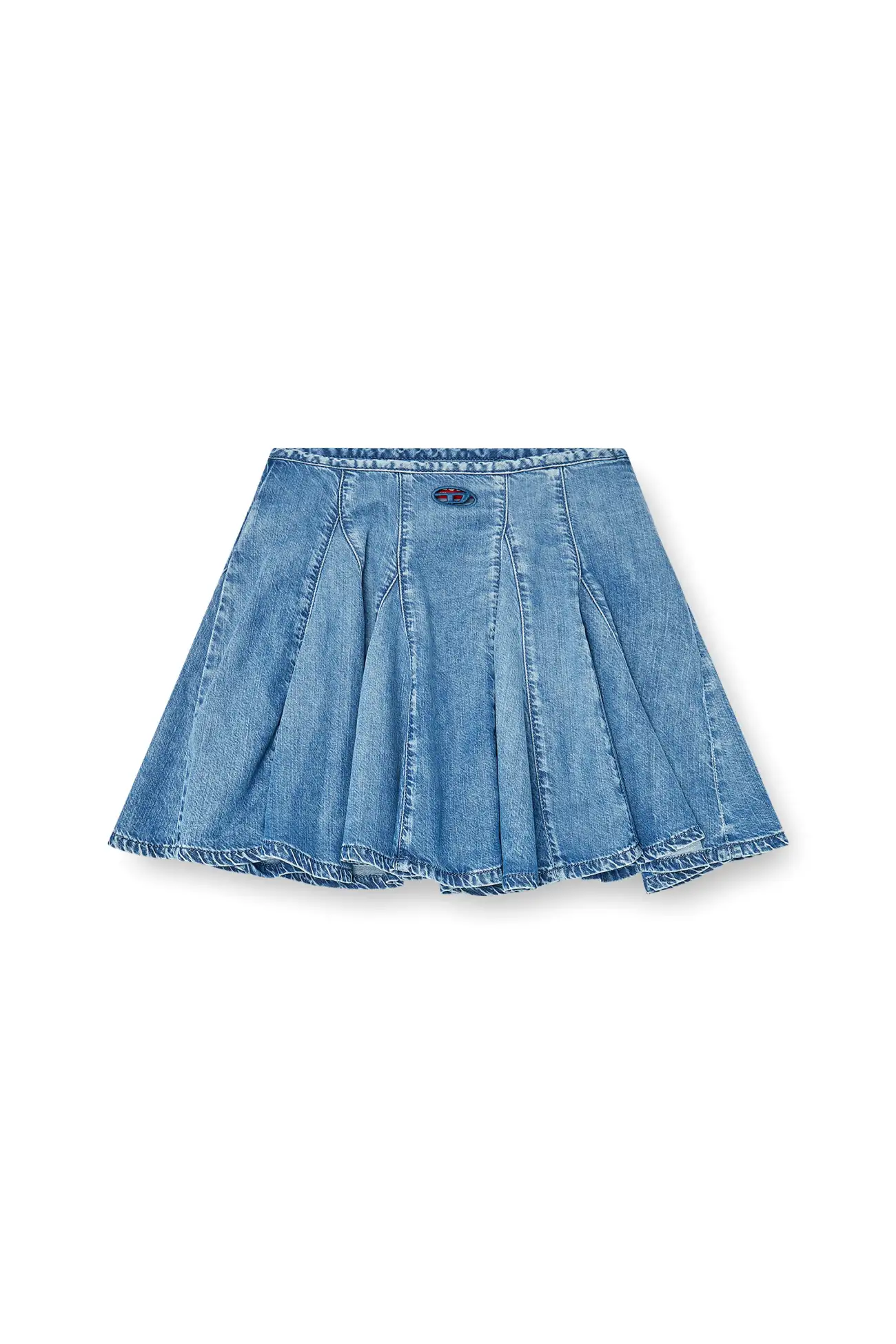 Mini skirt featuring a flared silhouette with structured pleats, crafted from a responsible blend of cotton and TENCEL™ Lyocell for a soft, fluid feel. The design is completed by a cut-out Oval D logo plaque on the front and treated to obtain a washed-look, medium blue hue.