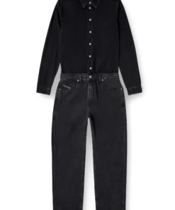 אוברול דנים כותנה בצבע שחור שמעוצב למראה של חולצה מכופתרת ומכנסי ג׳ינס, עם סגירת כפתורים ורקמת לוגו קטנה