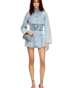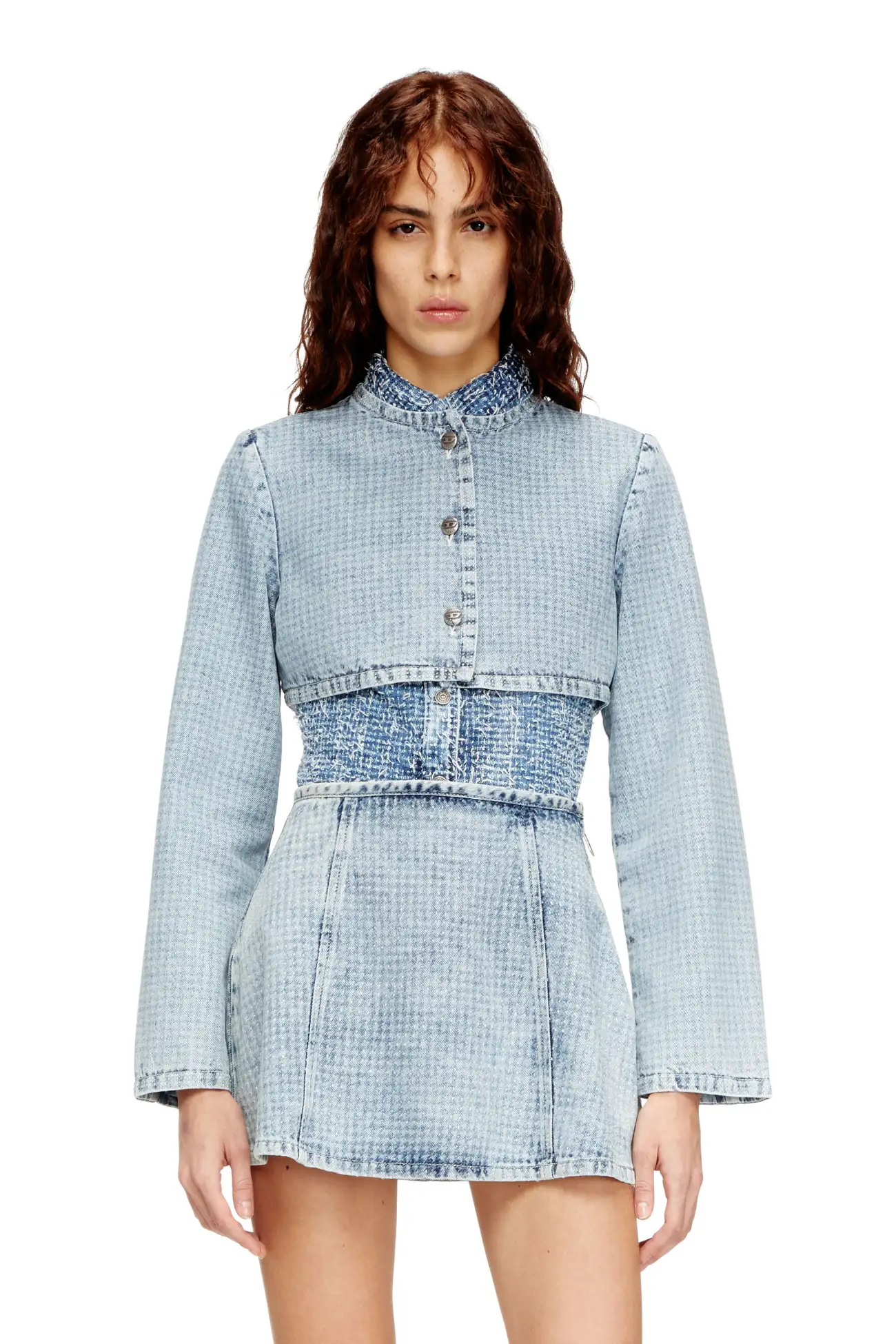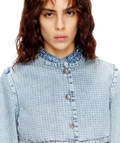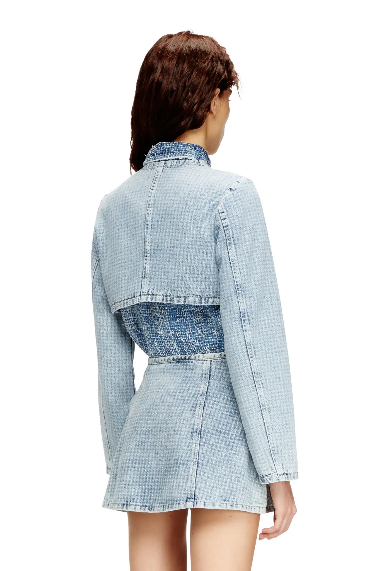 ג׳קט דנים קצר בהדפס האונדסטות' עם קריסטלים בצבע כחול, שלושה כפתורי מתכת ורמת גימור מוקפדת בגזרת קרופט מודרנית