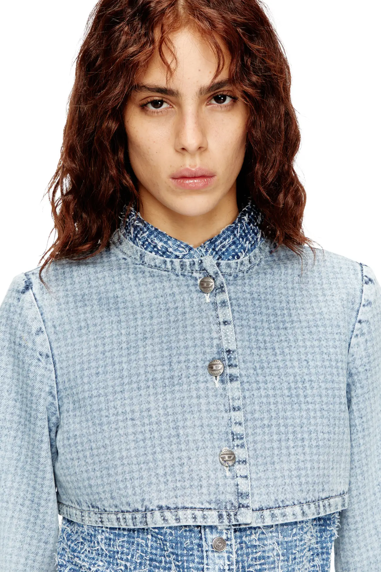 Showcasing an extra-short silhouette, this women's cropped jacket features long sleeves, a crew neck, and three branded metal buttons.