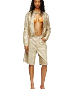 Cut in a loose, knee-length fit, these women’s five-pocket shorts are part of the exclusive Diesel × Karol G capsule. A longtime Diesel fan, the Colombian singer turned global superstar infuses the nine-piece collection — inspired by her chart-topping album Tropicoqueta — with a playful, daring energy. This grey cotton-TENCEL™ denim is overdyed in sandy tones, coated with shiny gold Mylar foil, and lasered for a signature distressed finish. A bright orange jacron tab at the back hallmarks the collaboration.