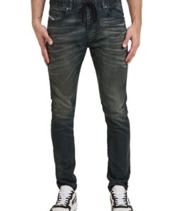 ג׳ינס כחול מבד ג׳וג ג׳ינס נעים ונוח, בגזרה מעט משוחררת במותניים והירכיים וצרה בקרסוליים, עם גומי ושרוך קשירה ושפשופים בברכיים